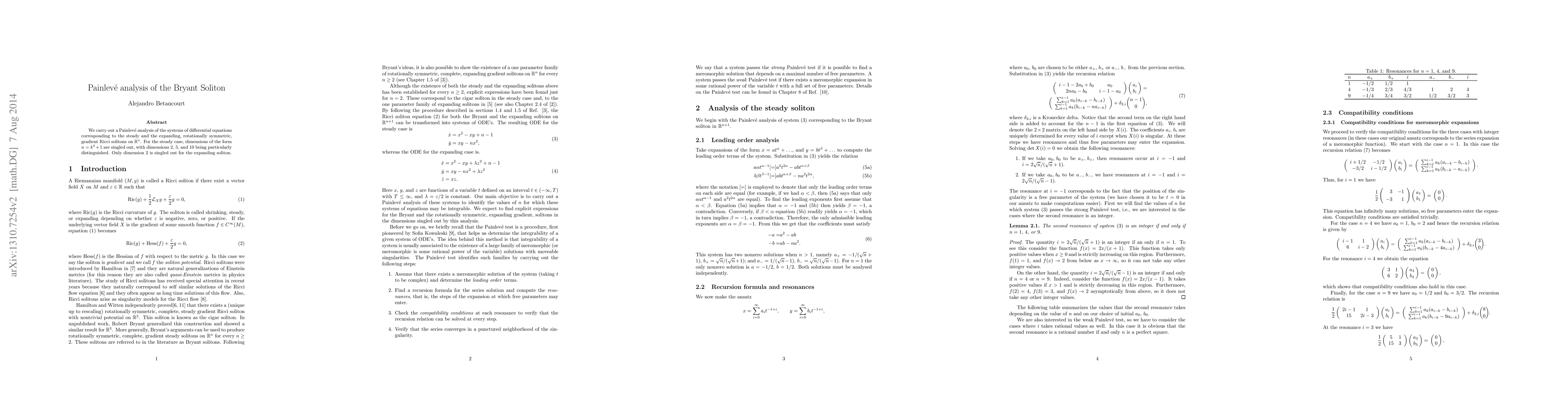 We carry out a Painlev\'e analysis of the systems of differential equations corresponding to the steady and the expanding, rotationally symmetric, gradient Ricci solitons on $\mathbb{R}^n$. For the steady case, dimensions of the form $n=k^2+1$ are singled out, with dimensions 2, 5, and 10 being particularly distinguished. Only dimension 2 is singled out for the expanding soliton.