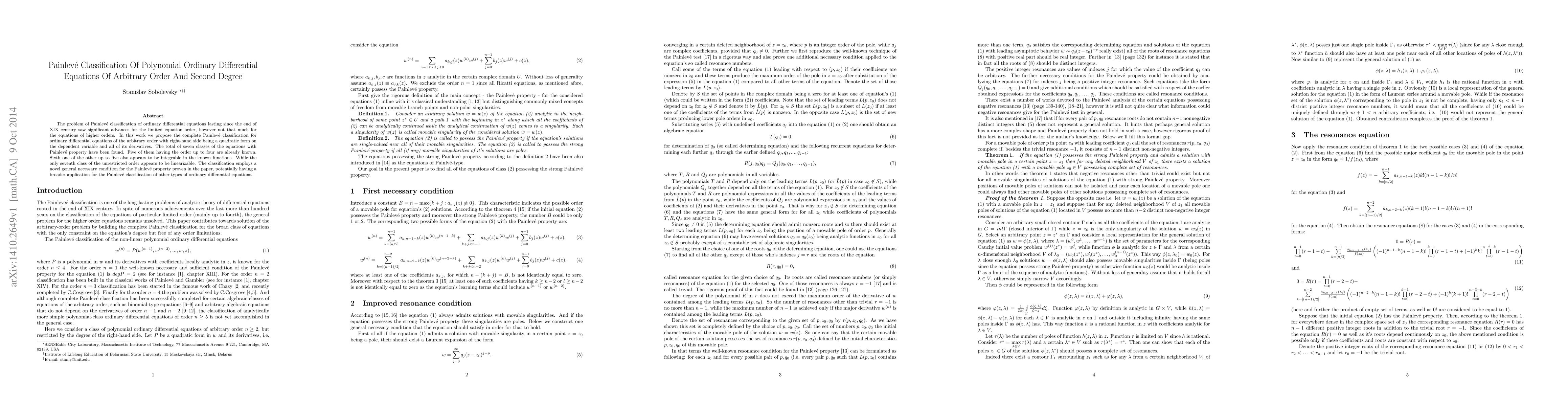 This paper presents the complete Painleve classification for polynomial ordinary differential equations of arbitrary order and second degree. It identifies seven classes of such equations, with five known and two new classes, and introduces a novel general necessary condition for the Painleve property applicable to broader classifications.