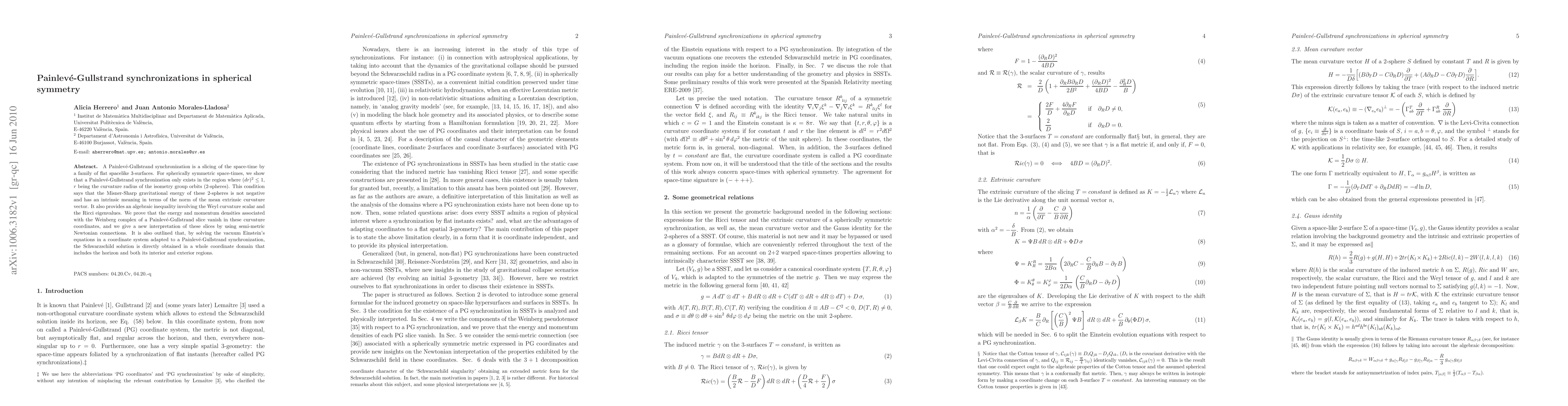 This paper explores Painlevé-Gullstrand synchronizations in spherically symmetric space-times, demonstrating their existence only within regions where the curvature radius condition holds, and showing that associated gravitational energies and momenta vanish. It also reveals that the Schwarzschild solution can be directly obtained from vacuum Einstein's equations in such a synchronization framework.