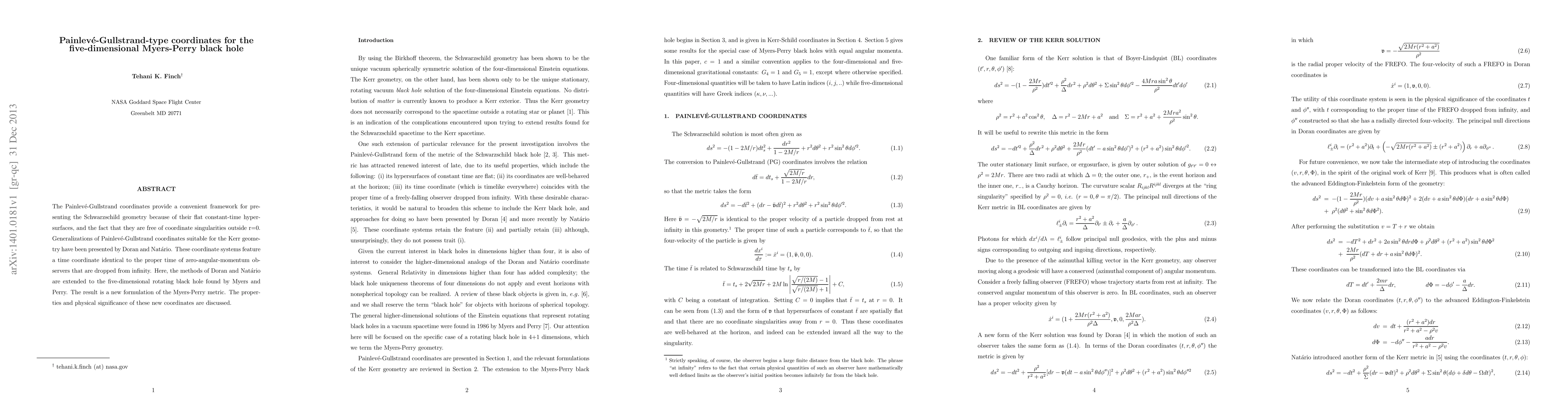 The Painleve-Gullstrand coordinates provide a convenient framework for presenting the Schwarzschild geometry because of their flat constant-time hypersurfaces, and the fact that they are free of coordinate singularities outside r=0. Generalizations of Painleve-Gullstrand coordinates suitable for the Kerr geometry have been presented by Doran and Natario. These coordinate systems feature a time coordinate identical to the proper time of zero-angular-momentum observers that are dropped from infinity. Here, the methods of Doran and Natario are extended to the five-dimensional rotating black hole found by Myers and Perry. The result is a new formulation of the Myers-Perry metric. The properties and physical significance of these new coordinates are discussed.