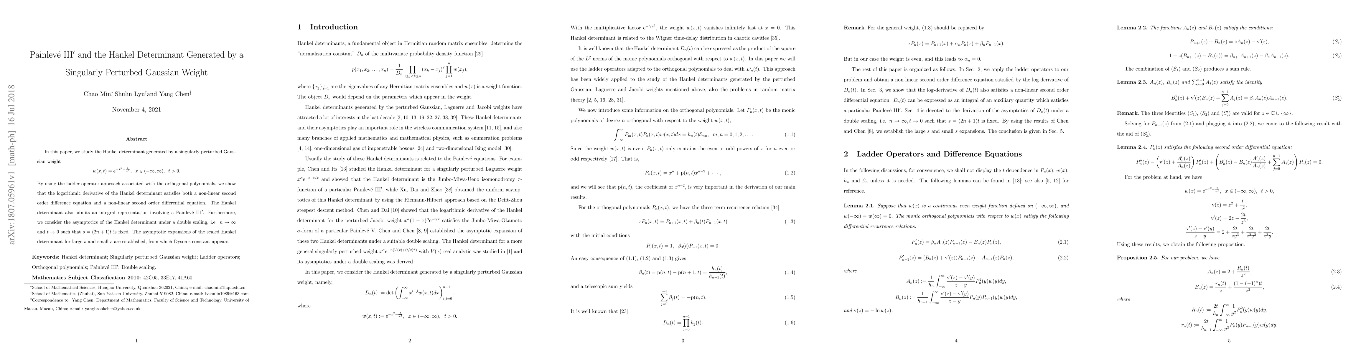 This paper investigates the Hankel determinant derived from a singularly perturbed Gaussian weight, revealing its connection to Painlevé III through integral representations. The logarithmic derivative of the determinant satisfies both a non-linear differential and difference equation, and asymptotic expansions reveal Dyson's constant under double scaling.