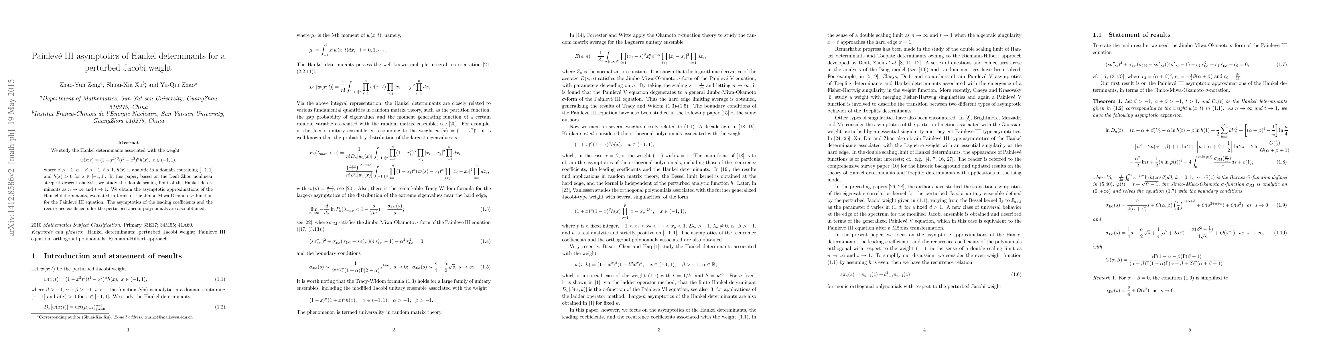 This paper investigates the asymptotic behavior of Hankel determinants for a perturbed Jacobi weight using Deift-Zhou analysis, revealing their connection to the Painlevé III equation through the Jimbo-Miwa-Okamoto $\sigma$-function, and derives the asymptotics of leading coefficients and recurrence coefficients for the perturbed Jacobi polynomials.