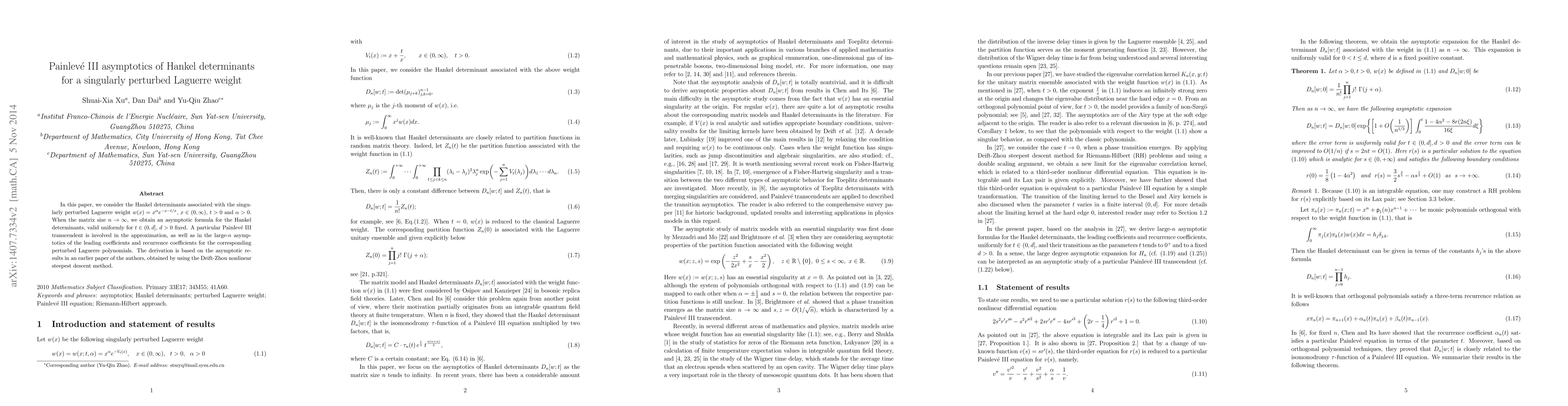 This paper derives an asymptotic formula for Hankel determinants associated with a singularly perturbed Laguerre weight, revealing the involvement of Painlevé III transcendents in the large-$n$ behavior of leading coefficients and recurrence coefficients for perturbed Laguerre polynomials. The results are derived using the Deift-Zhou nonlinear steepest descent method.