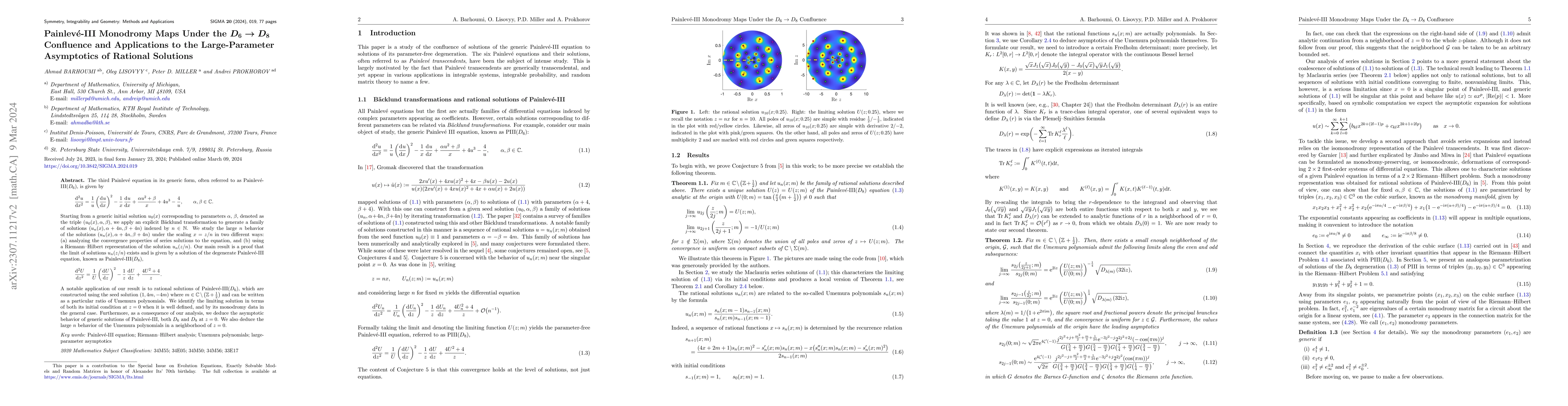 This paper investigates the convergence of solutions to the Painlevé-III($D_6$) equation under the $D_6 \to D_8$ confluence, proving that the limit yields a solution of the degenerate Painlevé-III($D_8$) equation. It also provides applications to the large-parameter asymptotics of rational solutions, determining their asymptotic behavior and the behavior of Umemura polynomials.