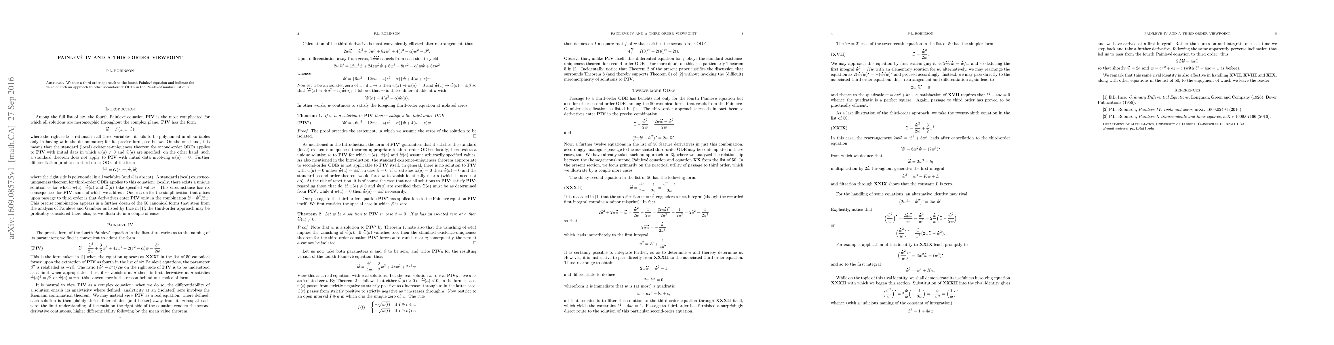 We take a third-order approach to the fourth Painlev\'e equation and indicate the value of such an approach to other second-order ODEs in the Painlev\'e-Gambier list of 50.