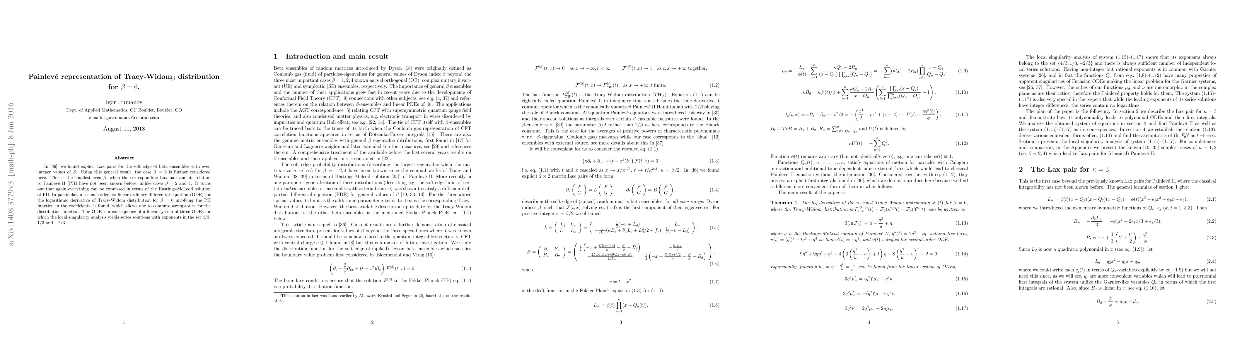 In arXiv:1306.2117, we found explicit Lax pairs for the soft edge of beta ensembles with even integer values of $\beta$. Using this general result, the case $\beta=6$ is further considered here. This is the smallest even $\beta$, when the corresponding Lax pair and its relation to Painlev\'e II (PII) have not been known before, unlike cases $\beta=2$ and $4$. It turns out that again everything can be expressed in terms of the Hastings-McLeod solution of PII. In particular, a second order nonlinear ODE for the logarithmic derivative of Tracy-Widom distribution for $\beta=6$ involving the PII function in the coefficients, is found, which allows one to compute asymptotics for the distribution function. The ODE is a consequence of a linear system of three ODEs for which the local singularity analysis yields series solutions with exponents in the set $4/3$, $1/3$ and $-2/3$.