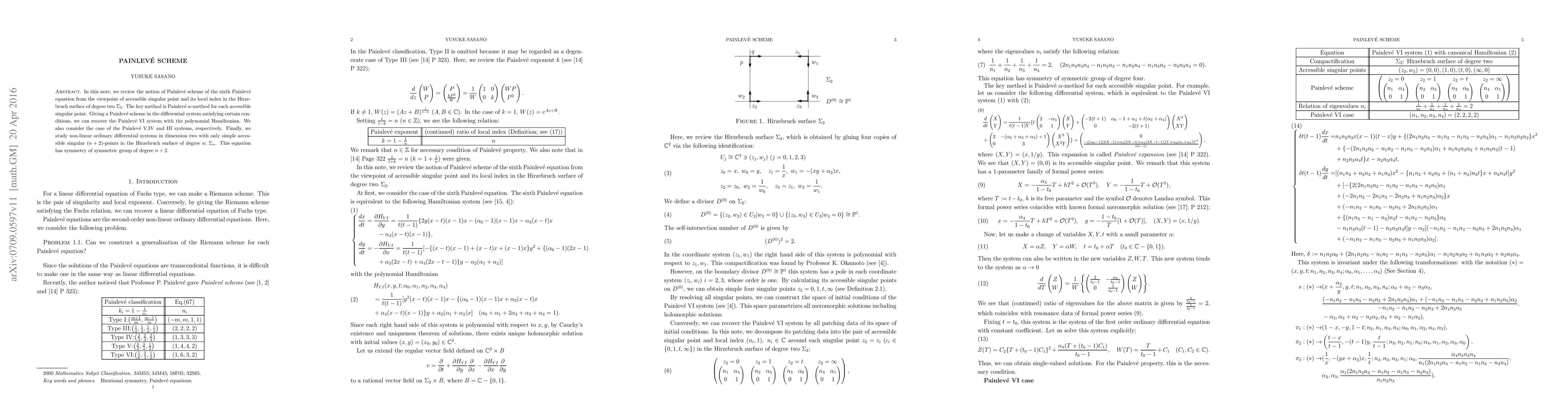 In this note, we review the notion of Painlev\'e scheme of the sixth Painlev\'e equation from the viewpoint of accessible singular point and its local index in the Hirzebruch surface of degree two ${\Sigma_2}$. The key method is Painlev\'e $\alpha$-method for each accessible singular point. Giving a Painlev\'e scheme in the differential system satisfying certain conditions, we can recover the Painlev\'e VI system with the polynomial Hamiltonian. We also consider the case of the Painlev\'e V,IV and III systems, respectively. Finally, we study non-linear ordinary differential systems in dimension two with only simple accessible singular $(n+2)$-points in the Hirzebruch surface of degree $n$; ${\Sigma_n}$. This equation has symmetry of symmetric group of degree $n+2$.