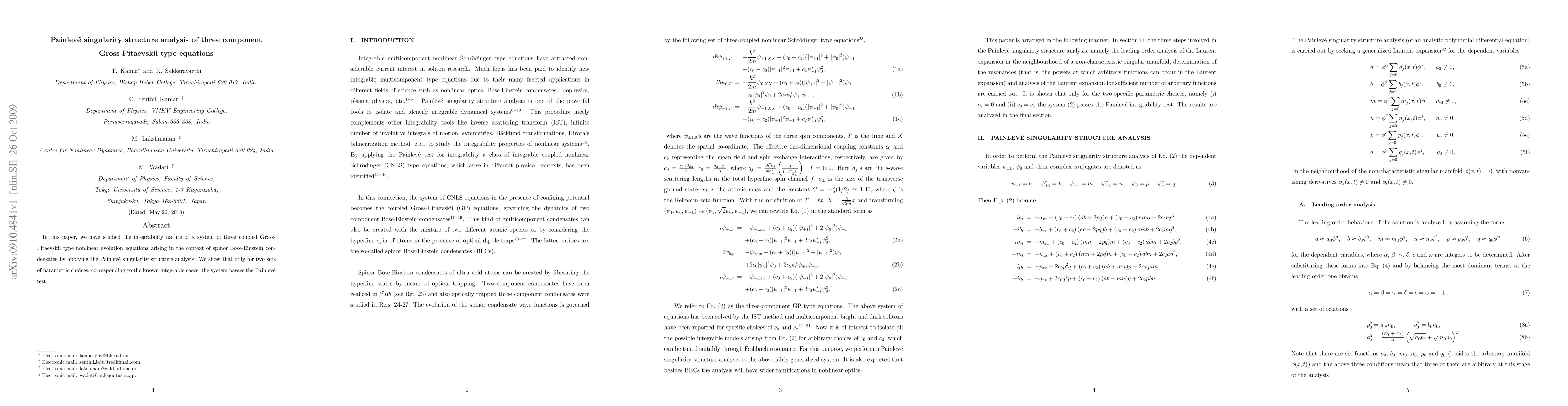 This paper analyzes the integrability of a system of three coupled Gross-Pitaevskii equations using Painlevé singularity structure analysis, finding that only two specific parametric configurations yield integrable behavior.