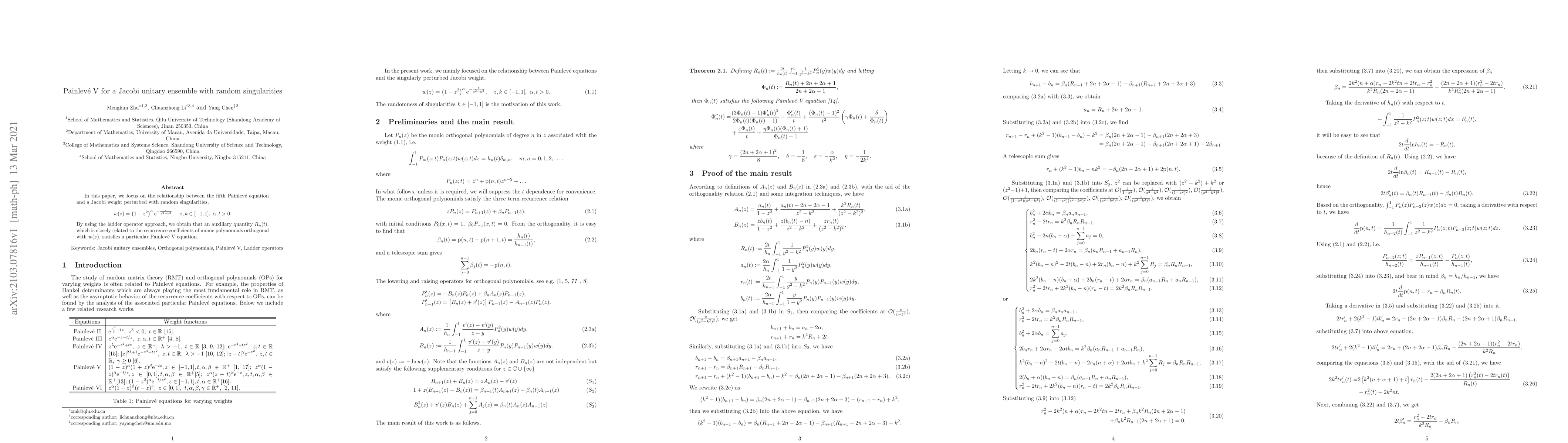 In this paper, we focus on the relationship between the fifth Painlev\'{e} equation and a Jacobi weight perturbed with random singularities, \begin{equation*} w(z)=\left(1-z^2\right)^{\alpha}{\rm e}^{-\frac{t}{z^2-k^2}},~~~z,k\in[-1,1],~\alpha,t>0. \end{equation*} By using the ladder operator approach, we obtain that an auxiliary quantity $R_n(t)$, which is closely related to the recurrence coefficients of monic polynomials orthogonal with $w(z)$, satisfies a particular Painlev\'{e} V equation.