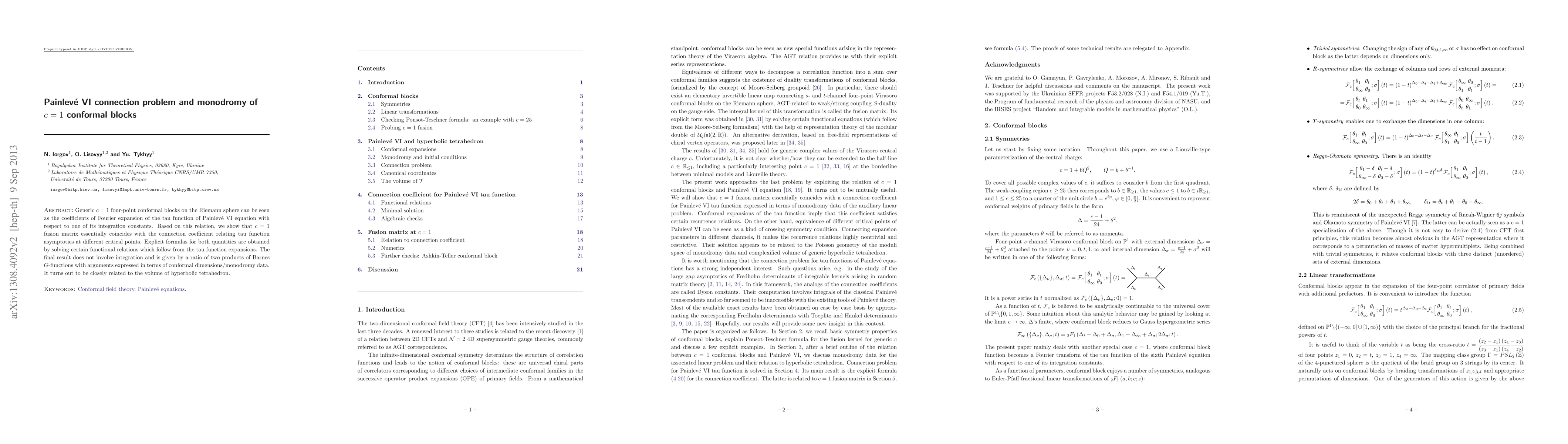 This paper establishes a connection between c=1 conformal blocks in two-dimensional conformal field theory and the tau function of the Painlevé VI equation, showing that the fusion matrix corresponds to connection coefficients. The result is expressed in terms of Barnes G-functions and relates to the volume of a hyperbolic tetrahedron.