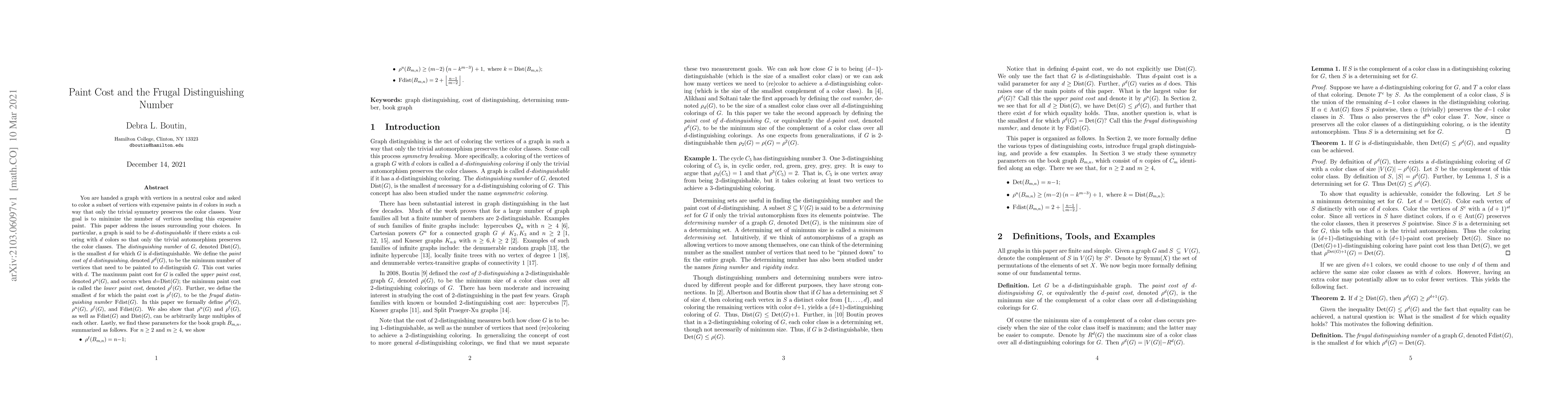 You are handed a graph with vertices in a neutral color and asked to color a subset of vertices with expensive paints in $d$ colors in such a way that only the trivial symmetry preserves the color classes. Your goal is to minimize the number of vertices needing this expensive paint. This paper address the issues surrounding your choices. In particular, a graph is said to be $d$-distinguishable if there exists a coloring with $d$ colors so that only the trivial automorphism preserves the color classes. The distinguishing number of $G$, denoted ${\rm Dist}(G)$, is the smallest $d$ for which $G$ is $d$-distinguishable. We define the -paint cost of $d$-distinguishing, denoted $\rho^d(G)$, to be the minimum number of vertices that need to be painted to $d$-distinguish $G$. This cost varies with $d$. The maximum paint cost for $G$ is called the upper paint cost, denoted $\rho^u(G)$, and occurs when $d={\rm Dist}(G)$; the minimum paint cost is called the lower paint cost, denoted $\rho^\ell(G)$. Further, we define the smallest $d$ for which the paint cost is $\rho^\ell(G)$, to be the frugal distinguishing number, ${\rm Fdist}(G)$. In this paper we formally define $\rho^d(G)$, $\rho^u(G)$, $\rho^\ell(G)$, and ${\rm Fdist}(G)$. We also show that $\rho^u(G)$ and $\rho^\ell(G)$, as well as ${\rm Fdist}(G)$ and ${\rm Dist}(G)$, can be arbitrarily large multiples of each other. Lastly, we find these parameters for the book graph $B_{m,n}$, summarized as follows. For $n\geq 2$ and $m\geq 4$, we show $\bullet$ $\rho^\ell(B_{m,n}) = n-1;$ $\bullet$ $\rho^u(B_{m,n}) \geq (m-2) \left( n-k^{m-3} \right) +1$, where $k={\rm Dist}(B_{m,n});$ $\bullet$ ${\rm Fdist}(B_{m,n}) = 2+\left\lfloor \frac{n-1}{m-2} \right\rfloor.$