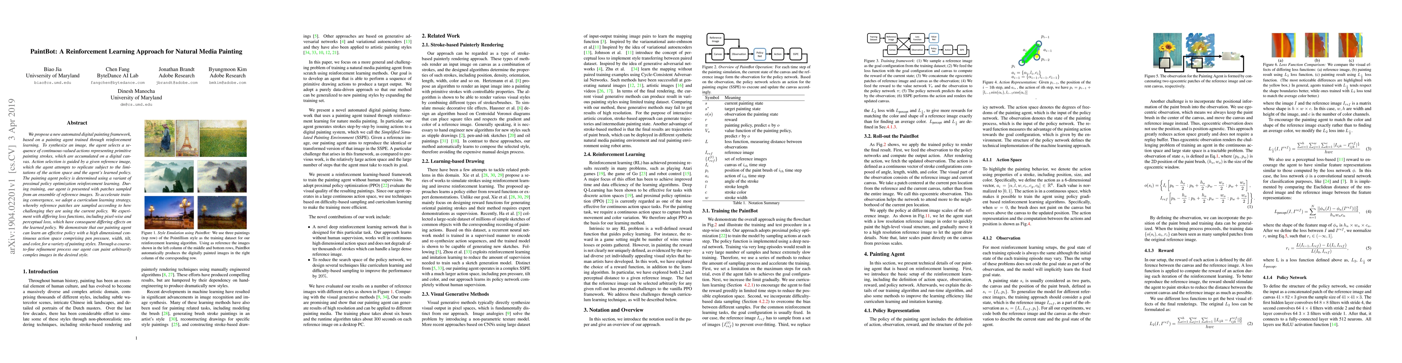 The paper introduces a reinforcement learning framework, PaintBot, for automated digital painting, utilizing a high-dimensional continuous action space and curriculum learning for efficient training.