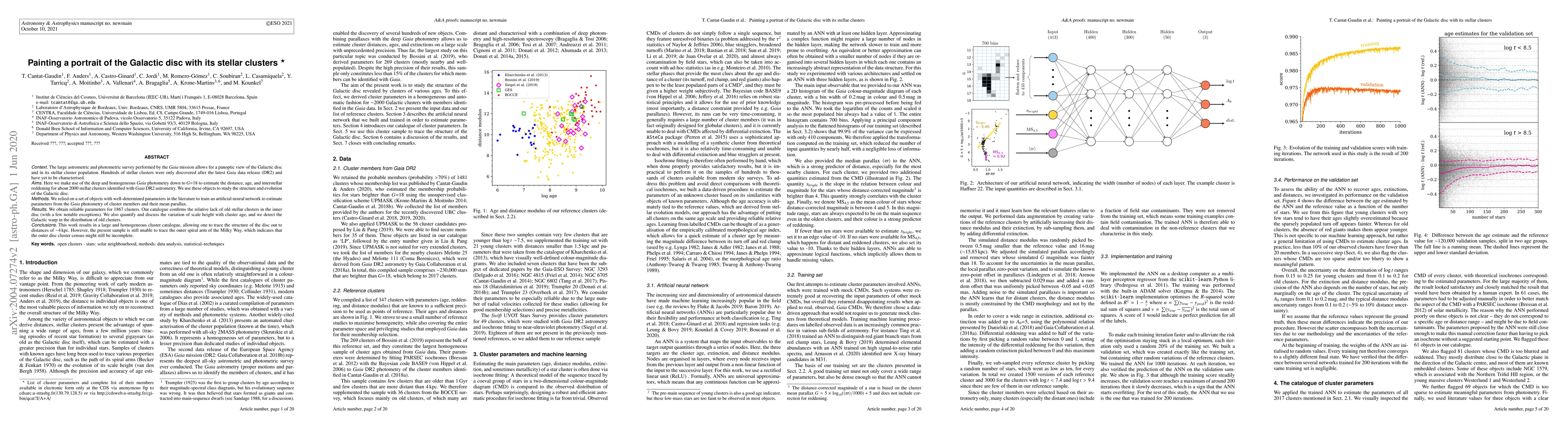 The large astrometric and photometric survey performed by the Gaia mission allows for a panoptic view of the Galactic disc and in its stellar cluster population. Hundreds of clusters were only discovered after the latest G data release (DR2) and have yet to be characterised. Here we make use of the deep and homogeneous Gaia photometry down to G=18 to estimate the distance, age, and interstellar reddening for about 2000 clusters identified with Gaia~DR2 astrometry. We use these objects to study the structure and evolution of the Galactic disc. We rely on a set of objects with well-determined parameters in the literature to train an artificial neural network to estimate parameters from the Gaia photometry of cluster members and their mean parallax. We obtain reliable parameters for 1867 clusters. Our new homogeneous catalogue confirms the relative lack of old clusters in the inner disc (with a few notable exceptions). We also quantify and discuss the variation of scale height with cluster age, and detect the Galactic warp in the distribution of old clusters. This work results in a large and homogenous cluster catalogue. However, the present sample is still unable to trace the Outer spiral arm of the Milky Way, which indicates that the outer disc cluster census might still be incomplete.