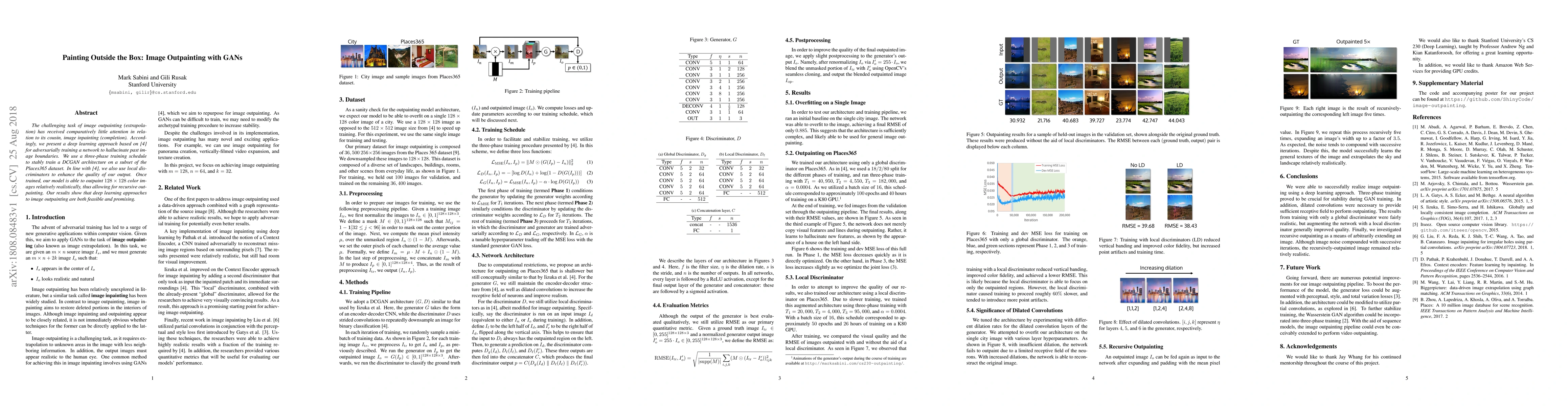 This paper proposes a deep learning method using GANs to perform image outpainting, a task that extends image boundaries beyond their original limits. The authors employ a DCGAN architecture and a three-phase training schedule, achieving relatively realistic outpainting of $128 \times 128$ images, demonstrating the potential of deep learning for this underexplored task.