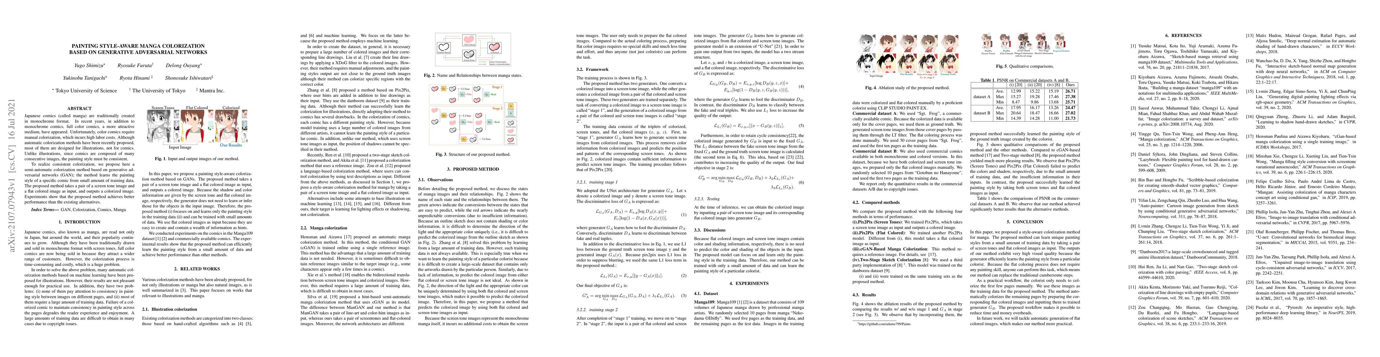 This paper proposes a semi-automatic colorization method for manga using generative adversarial networks (GAN) to maintain consistent painting styles. The method trains on a small dataset to learn the specific style, achieving better colorization results compared to existing methods.