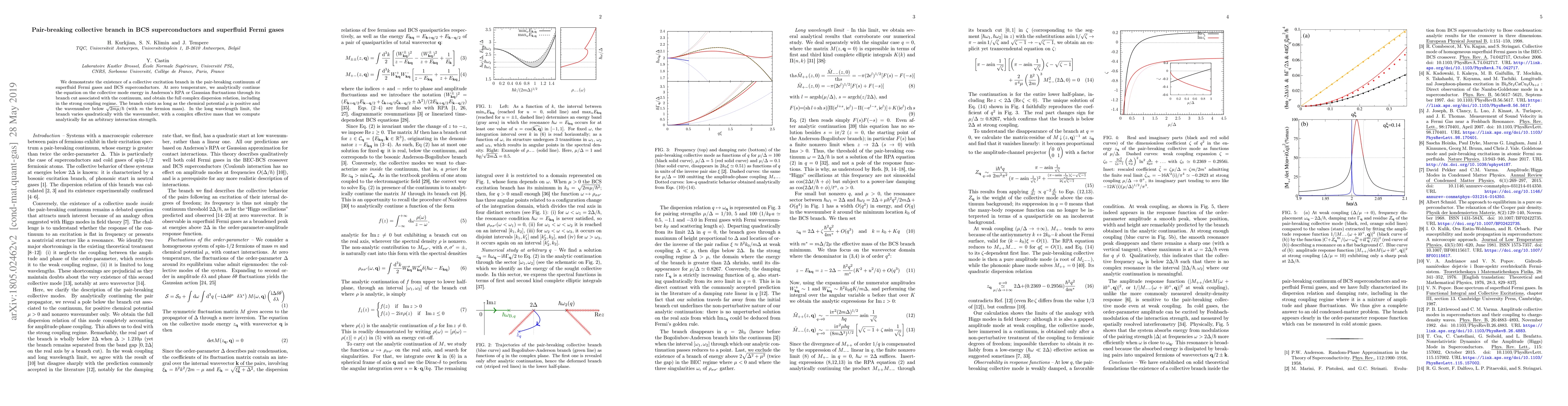 We demonstrate the existence of a collective excitation branch in the pair-breaking continuum of superfluid Fermi gases and BCS superconductors. At zero temperature, we analytically continue the equation on the collective mode energy in Anderson's Random Phase Approximation or Gaussian fluctuations through its branch cut associated with the continuum, and obtain the full complex dispersion relation, including in the strong coupling regime. The branch exists as long as the chemical potential $\mu$ is positive and the wave number below $\sqrt{2m\mu}/\hbar$ (with m the fermion mass). In the long wavelength limit, the branch varies quadratically with the wave number, with a complex effective mass that we compute analytically for an arbitrary interaction strength.