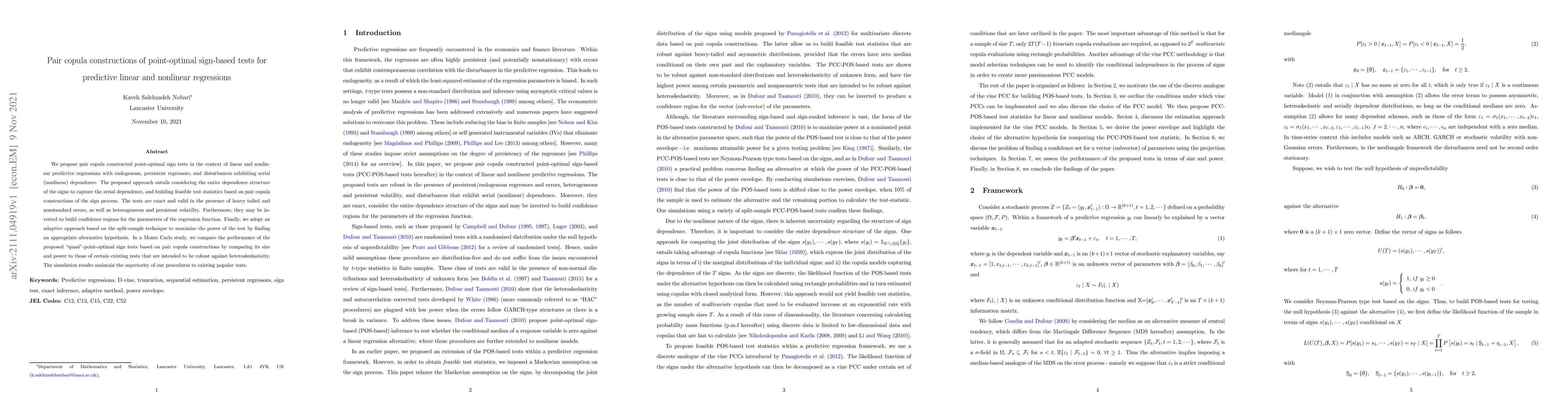 We propose pair copula constructed point-optimal sign tests in the context of linear and nonlinear predictive regressions with endogenous, persistent regressors, and disturbances exhibiting serial (nonlinear) dependence. The proposed approach entails considering the entire dependence structure of the signs to capture the serial dependence, and building feasible test statistics based on pair copula constructions of the sign process. The tests are exact and valid in the presence of heavy tailed and nonstandard errors, as well as heterogeneous and persistent volatility. Furthermore, they may be inverted to build confidence regions for the parameters of the regression function. Finally, we adopt an adaptive approach based on the split-sample technique to maximize the power of the test by finding an appropriate alternative hypothesis. In a Monte Carlo study, we compare the performance of the proposed "quasi"-point-optimal sign tests based on pair copula constructions by comparing its size and power to those of certain existing tests that are intended to be robust against heteroskedasticity. The simulation results maintain the superiority of our procedures to existing popular tests.