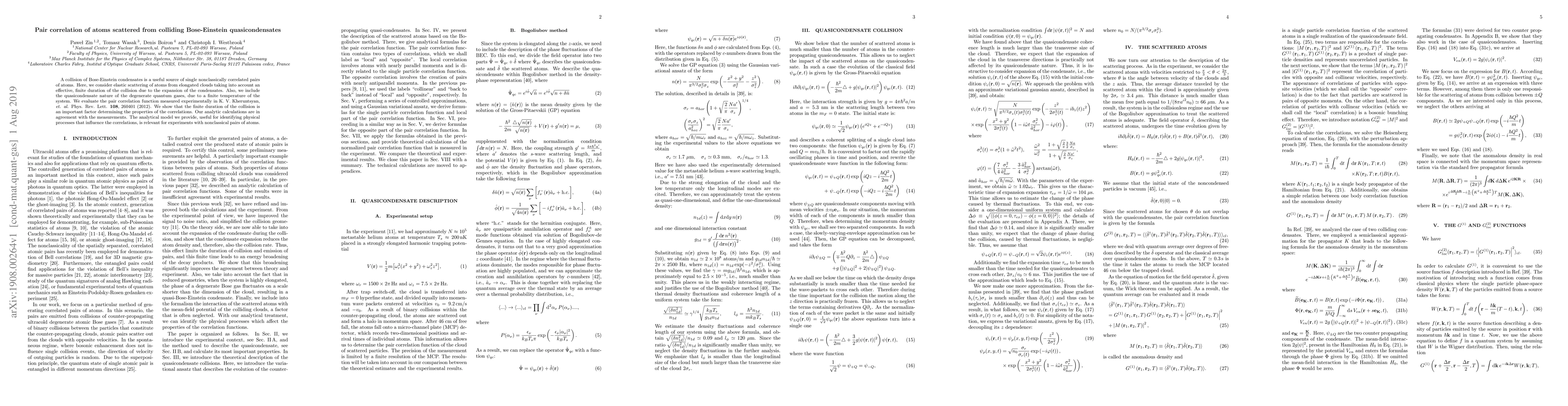 A collision of Bose-Einstein condensates is a useful source of single nonclassically correlated pairs of atoms. Here, we consider elastic scattering of atoms from elongated clouds taking into account an effective, finite duration of the collision due to the expansion of the condensates. Also, we include the quasicondensate nature of the degenerate quantum gases, due to a finite temperature of the system. We evaluate the pair correlation function measured experimentally in K. V. Kheruntsyan, et. al. Phys. Rev. Lett. 108, 260401 (2012). We show that the finite duration of the collision is an important factor determining the properties of the correlations. Our analytic calculations are in agreement with the measurements. The analytical model we provide, useful for identifying physical processes that influence the correlations, is relevant for experiments with nonclassical pairs of atoms.