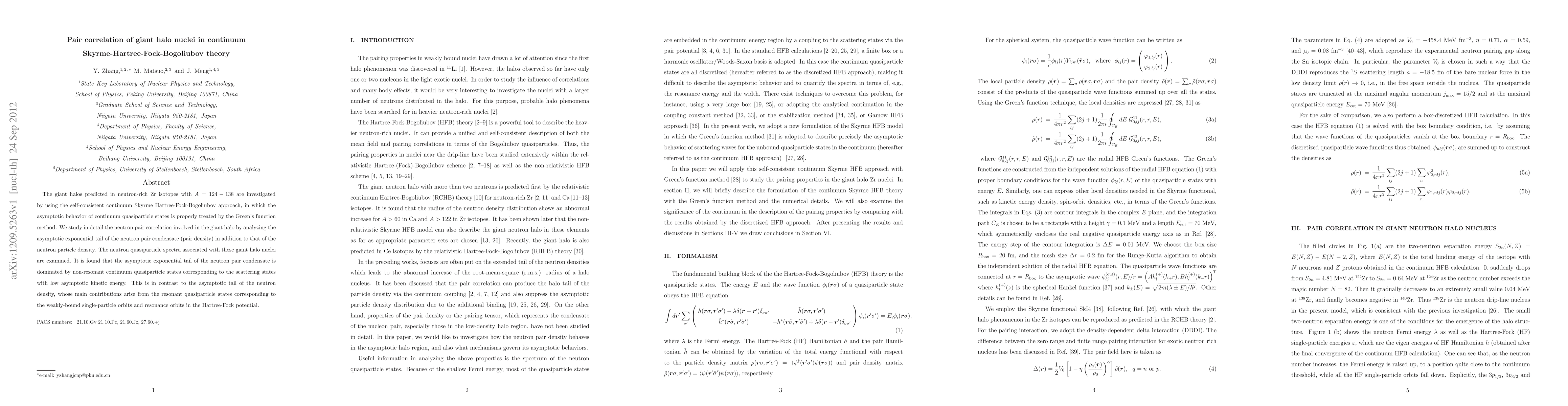 This paper investigates neutron pair correlations in giant halo nuclei of neutron-rich Zr isotopes using the continuum Skyrme-Hartree-Fock-Bogoliubov theory. It finds that the neutron pair condensate's tail is dominated by non-resonant continuum quasiparticles, contrasting with the neutron density's tail, which is mainly influenced by resonant quasiparticles.