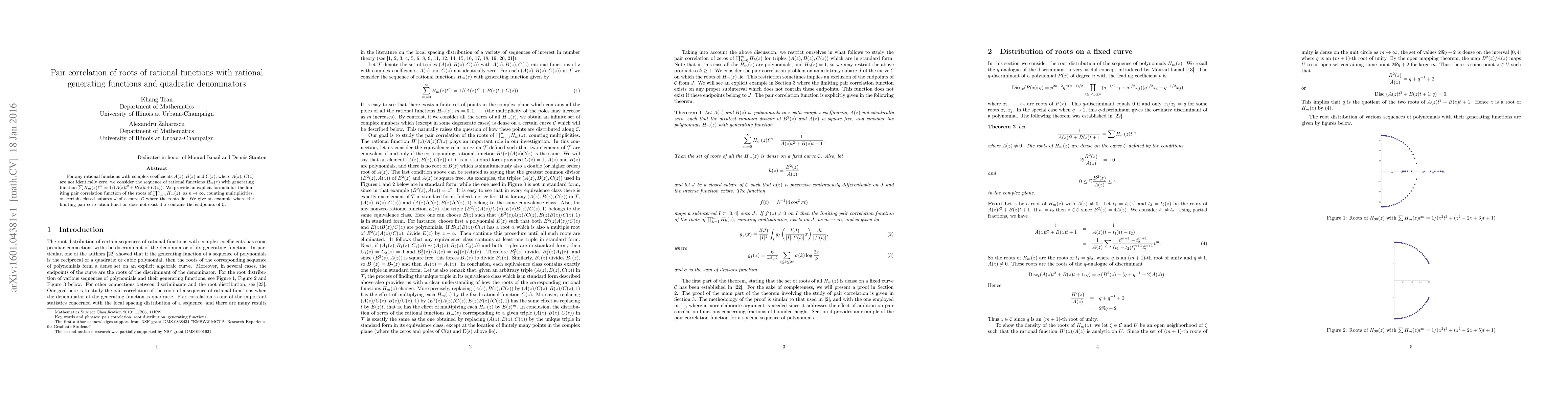 This paper studies the correlation of roots of rational functions as their generating function approaches a quadratic denominator, analyzing its limiting behavior and exceptions.