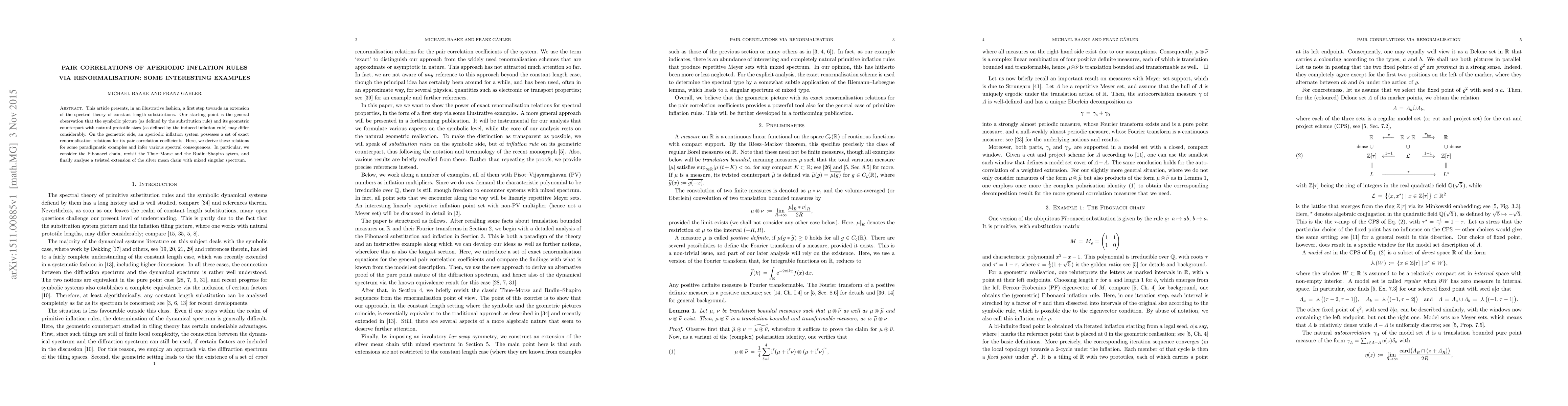 This paper explores the relationship between symbolic and geometric aspects of aperiodic inflation systems, deriving renormalisation relations for pair correlation coefficients in examples like Fibonacci chain, Thue-Morse, Rudin-Shapiro, and a twisted silver mean chain. It extends spectral theory of constant length substitutions, revealing spectral consequences of these aperiodic systems.