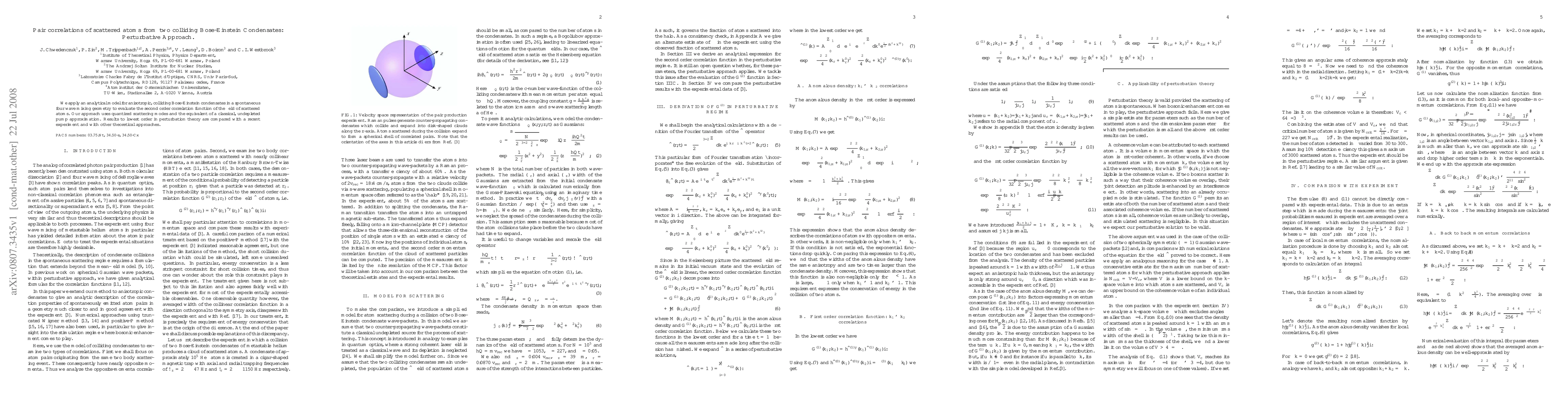 This paper evaluates the second-order correlation function of scattered atoms from two colliding Bose-Einstein condensates using a perturbative analytical model, comparing results to experimental data and other theoretical methods. The approach employs quantized scattering modes and a classical undepleted pump approximation.
