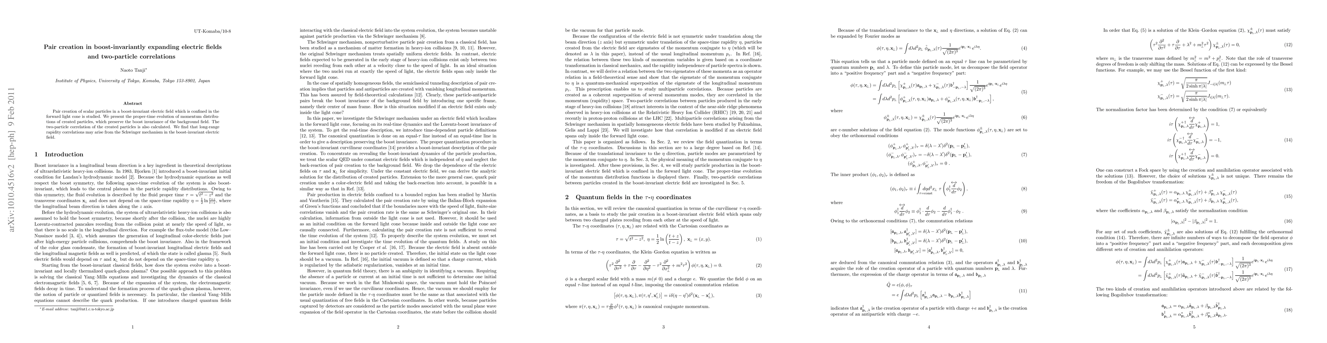 This paper investigates the pair creation of scalar particles in a boost-invariant electric field confined to the forward light cone, analyzing the proper-time evolution of momentum distributions. It also calculates the two-particle correlation, revealing that long-range rapidity correlations may emerge from the Schwinger mechanism in such fields.