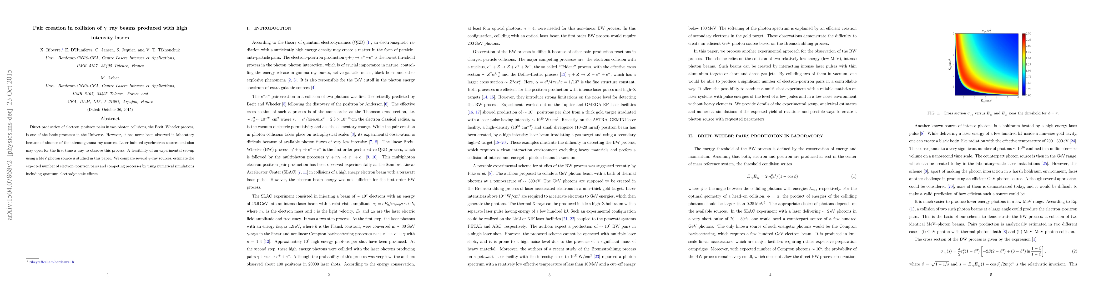 Direct production of electron--positron pairs in two photon collisions, the Breit--Wheeler process, is one of the basic processes in the Universe. However, it has never been observed in laboratory because of absence of the intense gamma-ray sources. Laser induced synchrotron sources emission may open for the first time a way to observe this process. A feasibility of an experimental set--up using a MeV photon source is studied in this paper. We compare several $\gamma$--ray sources, estimate the expected number of electron--positron pairs and competing processes by using numerical simulations including quantum electrodynamic effects.