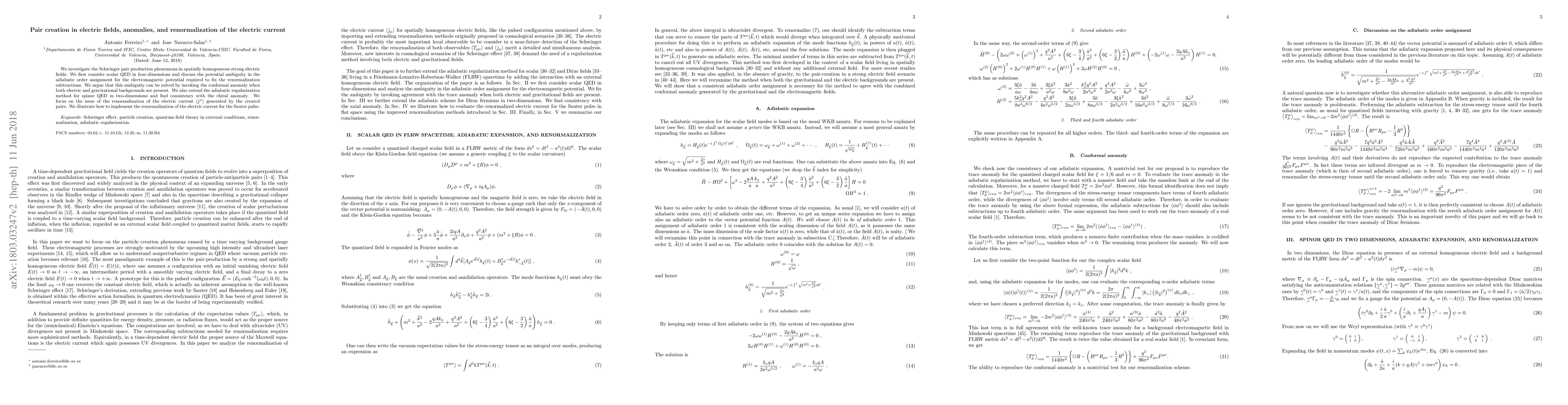 We investigate the Schwinger pair production phenomena in spatially homogeneous strong electric fields. We first consider scalar QED in four-dimensions and discuss the potential ambiguity in the adiabatic order assignment for the electromagnetic potential required to fix the renormalization subtractions. We argue that this ambiguity can be solved by invoking the conformal anomaly when both electric and gravitational backgrounds are present. We also extend the adiabatic regularization method for spinor QED in two-dimensions and find consistency with the chiral anomaly. We focus on the issue of the renormalization of the electric current $\langle j^\mu \rangle$ generated by the created pairs. We illustrate how to implement the renormalization of the electric current for the Sauter pulse.