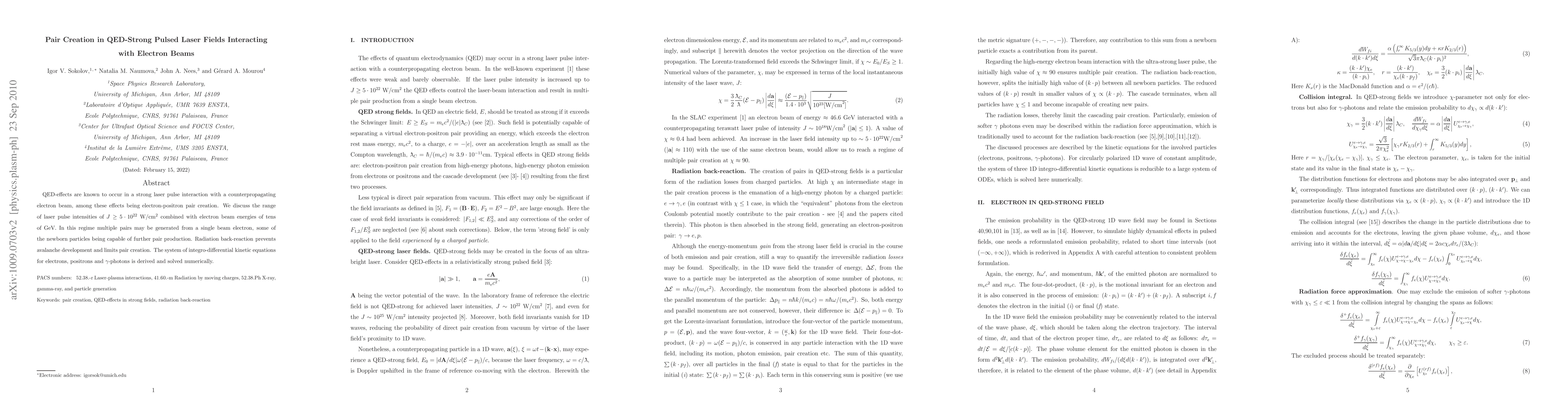 QED-effects are known to occur in a strong laser pulse interaction with a counter-propagating electron beam, among these effects being electron-positron pair creation. We discuss the range of laser pulse intensities of J > 5*10^22 W/cm2 combined with electron beam energies of tens of GeV. In this regime multiple pairs may be generated from a single beam electron, some of the newborn particles being capable of further pair production. Radiation back-reaction prevents avalanche development and limits pair creation. The system of integro-differential kinetic equations for electrons, positrons and \gamma-photons is derived and solved numerically.