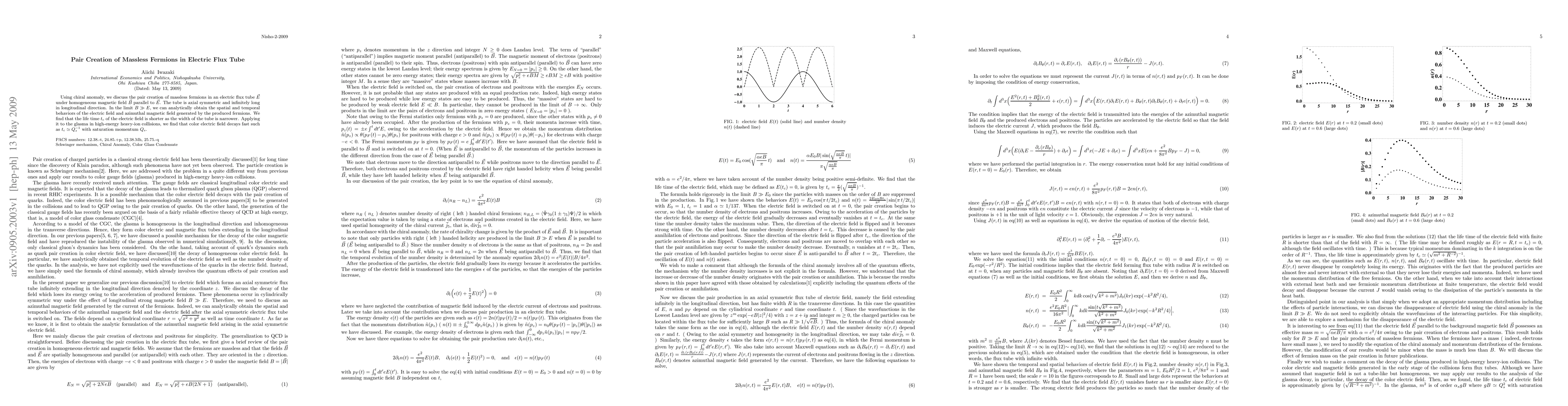 Using chiral anomaly, we discuss the pair creation of massless fermions in an electric flux tube $\vec{E}$ under homogeneous magnetic field $\vec{B}$ parallel to $\vec{E}$. The tube is axial symmetric and infinitely long in longitudinal direction. In the limit $B\gg E$, we can analytically obtain the spatial and temporal behaviors of the electric field and azimuthal magnetic field generated by the produced fermions. We find that the life time $t_c$ of the electric field is shorter as the width of the tube is narrower. Applying it to the glasma in high-energy heavy-ion collisions, we find that color electric field decays fast such as $t_c\simeq Q_s^{-1}$ with saturation momentum $Q_s$.