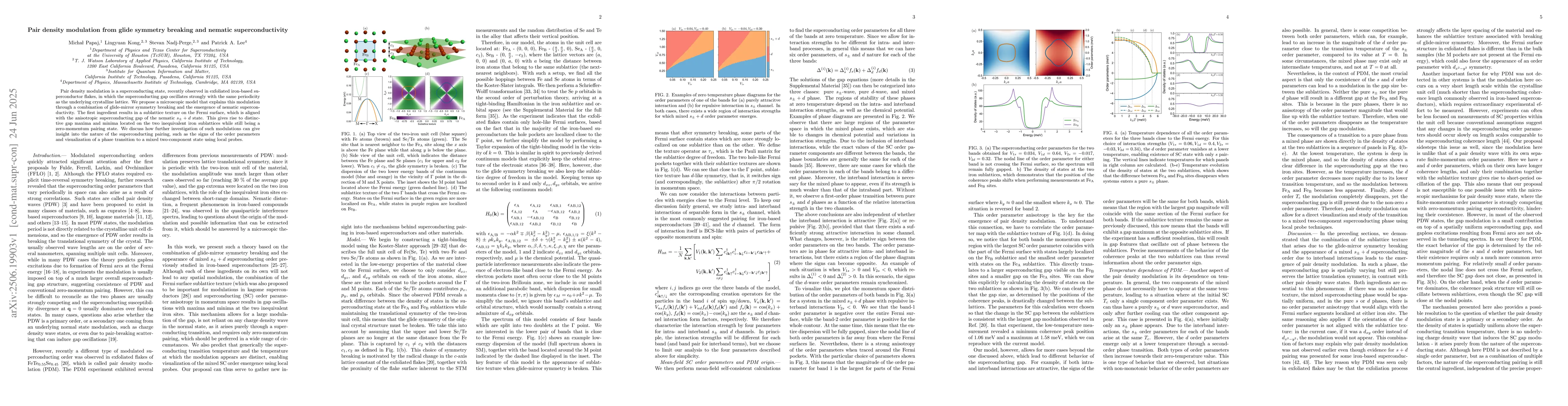 Pair density modulation is a superconducting state, recently observed in exfoliated iron-based superconductor flakes, in which the superconducting gap oscillates strongly with the same periodicity as the underlying crystalline lattice. We propose a microscopic model that explains this modulation through a combination of glide-mirror symmetry breaking and the emergence of nematic superconductivity. The first ingredient results in a sublattice texture on the Fermi surface, which is aligned with the anisotropic superconducting gap of the nematic $s_\pm+d$ state. This gives rise to distinctive gap maxima and minima located on the two inequivalent iron sublattices while still being a zero-momentum pairing state. We discuss how further investigation of such modulations can give insight into the nature of the superconducting pairing, such as the signs of the order parameters and visualization of a phase transition to a mixed two-component state using local probes.