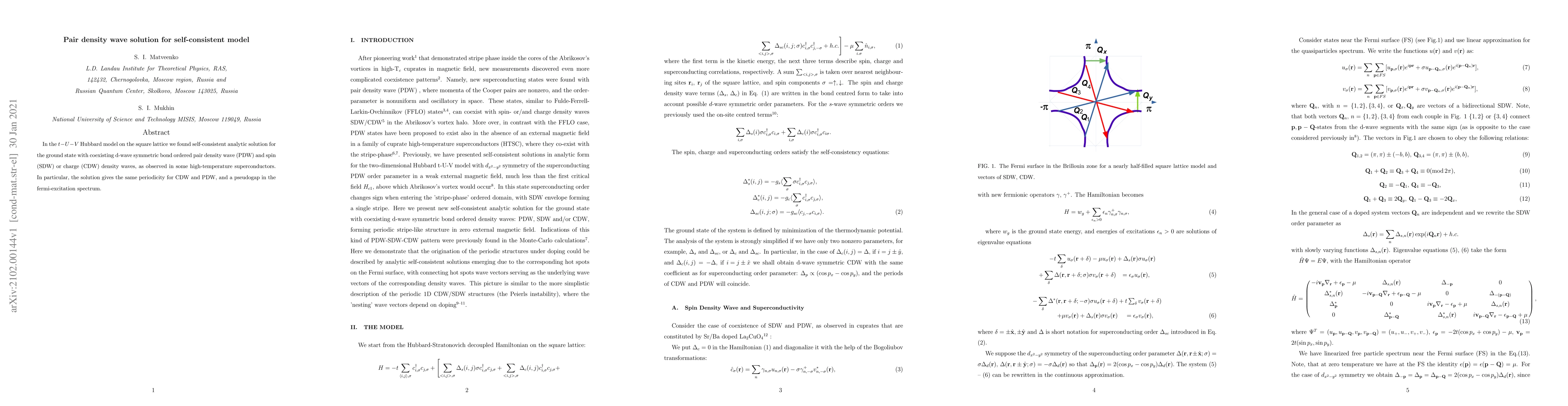 In the t-U-V Hubbard model on the square lattice we found self-consistent analytic solution for the ground state with coexisting d-wave symmetric bond ordered pair density wave (PDW) and spin (SDW) or charge (CDW) density waves, as observed in some high-temperature superconductors. In particular, the solution gives the same periodicity for CDW and PDW, and a pseudogap in the fermi-excitation spectrum.
