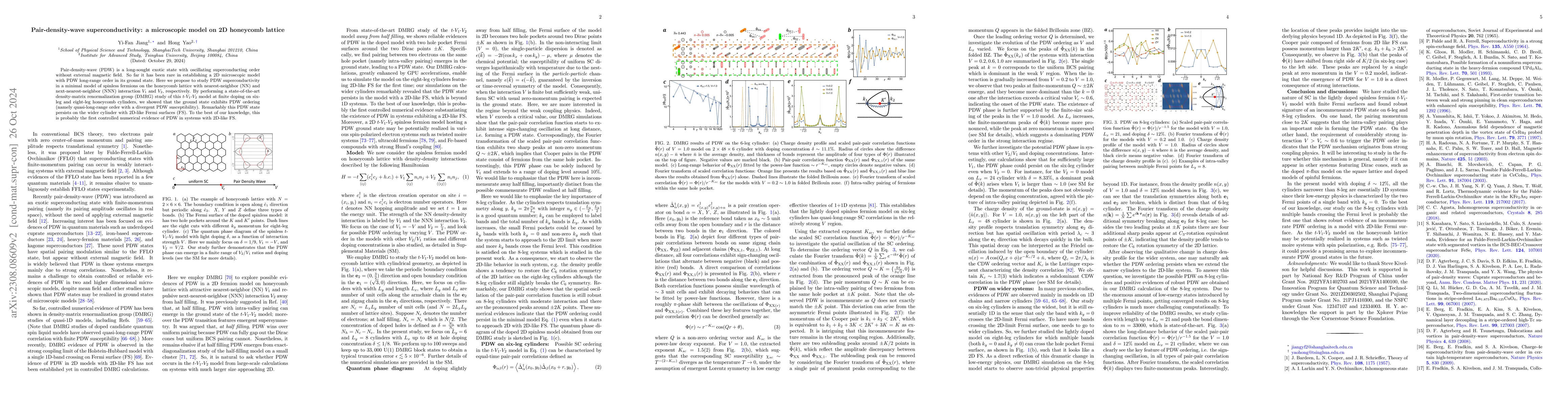 This paper proposes a microscopic model of pair-density-wave superconductivity in a two-dimensional spinless fermion system on a honeycomb lattice, demonstrating quasi-long-range order and persistence of the PDW state through advanced density-matrix renormalization group studies. This provides the first controlled numerical evidence of PDW superconductivity in systems with two-dimensional-like Fermi surfaces.