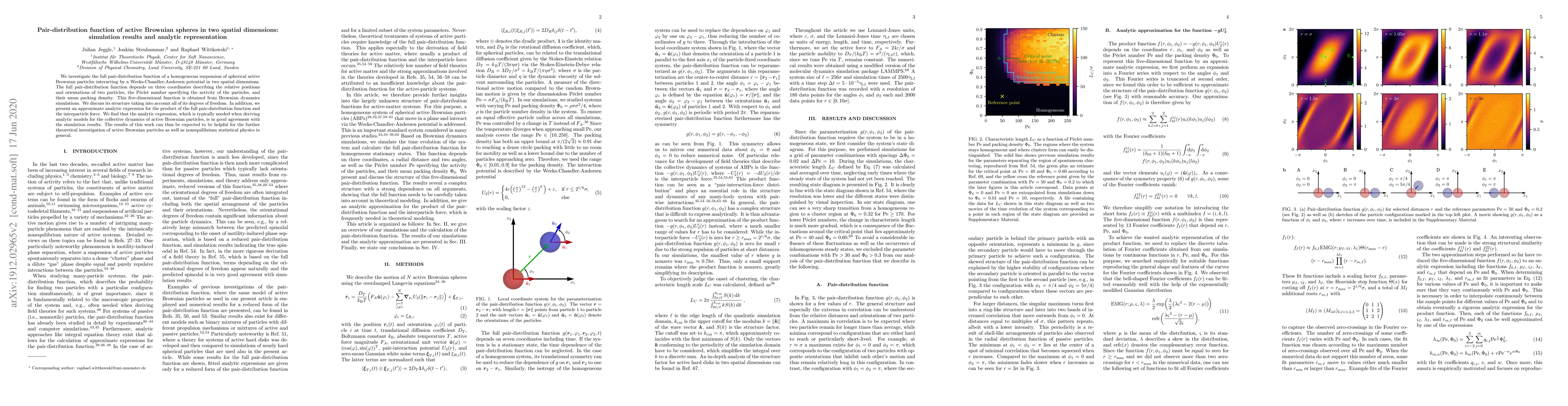 This paper investigates the five-dimensional pair-distribution function of active Brownian spheres in two dimensions via Brownian dynamics simulations, revealing its complex structure. An approximate analytic expression for the function's product with interparticle force is also presented, showing good agreement with simulation results, which aids theoretical models for active particle dynamics and nonequilibrium statistical physics.