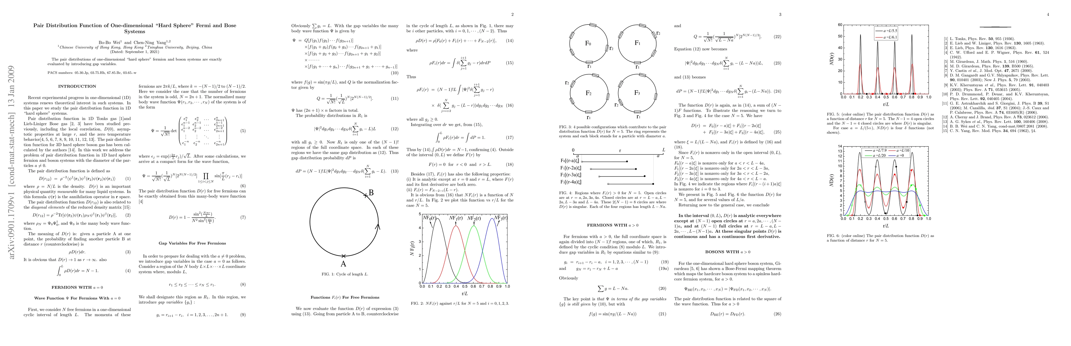 Summary: This paper precisely evaluates the pair distributions of one-dimensional "hard sphere" Fermi and Bose systems using gap variables, providing exact solutions for these quantum statistical models. The methodology introduces a novel approach to understanding these systems' interactions.