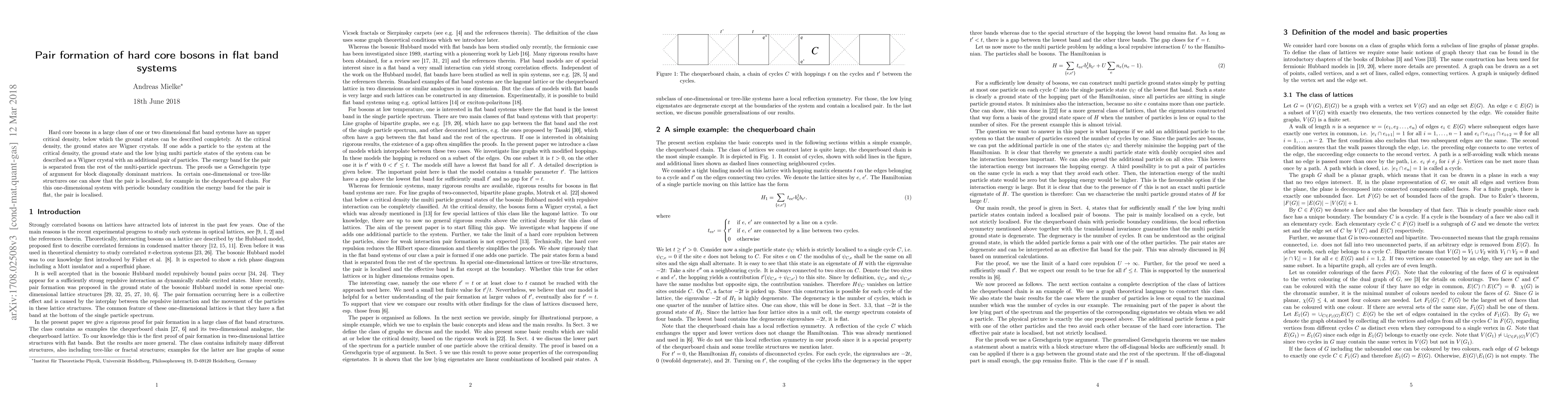 Hard core bosons in a large class of one or two dimensional flat band systems have an upper critical density, below which the ground states can be described completely. At the critical density, the ground states are Wigner crystals. If one adds a particle to the system at the critical density, the ground state and the low lying multi particle states of the system can be described as a Wigner crystal with an additional pair of particles. The energy band for the pair is separated from the rest of the multi-particle spectrum. The proofs use a Gerschgorin type of argument for block diagonally dominant matrices. In certain one-dimensional or tree-like structures one can show that the pair is localised, for example in the chequerboard chain. For this one-dimensional system with periodic boundary condition the energy band for the pair is flat, the pair is localised.