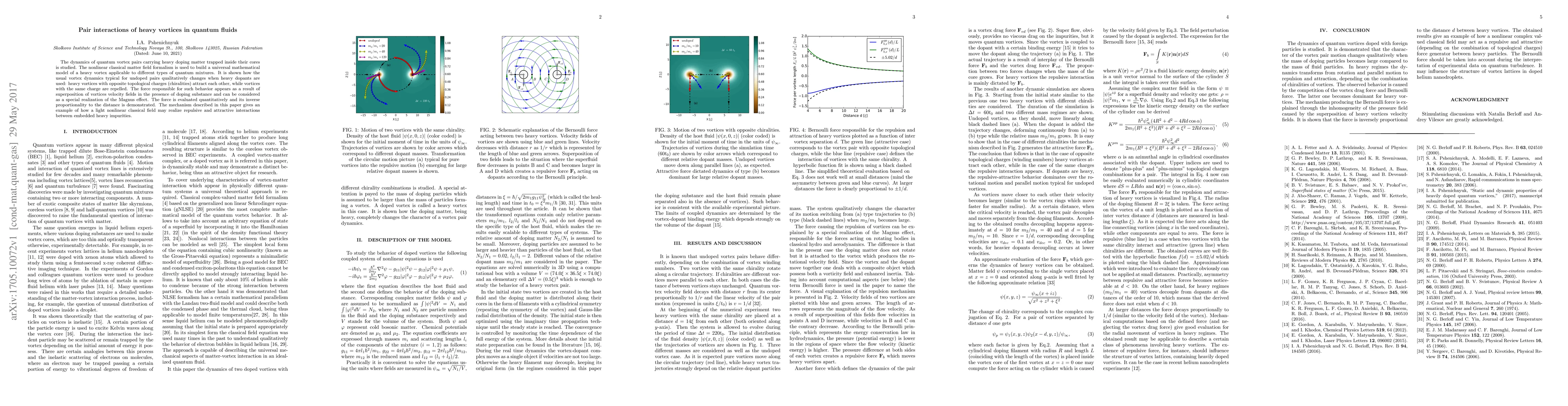 The dynamics of quantum vortex pairs carrying heavy doping matter trapped inside their cores is studied. The nonlinear classical matter field formalism is used to build a universal mathematical model of a heavy vortex applicable to different types of quantum mixtures. It is shown how the usual vortex dynamics typical for undoped pairs qualitatively changes when heavy dopants are used: heavy vortices with opposite topological charges (chiralities) attract each other, while vortices with the same charge are repelled. The force responsible for such behavior appears as a result of superposition of vortices velocity fields in the presence of doping substance and can be considered as a special realization of the Magnus effect. The force is evaluated quantitatively and its inverse proportionality to the distance is demonstrated. The mechanism described in this paper gives an example of how a light nonlinear classical field may realize repulsive and attractive interactions between embedded heavy impurities.