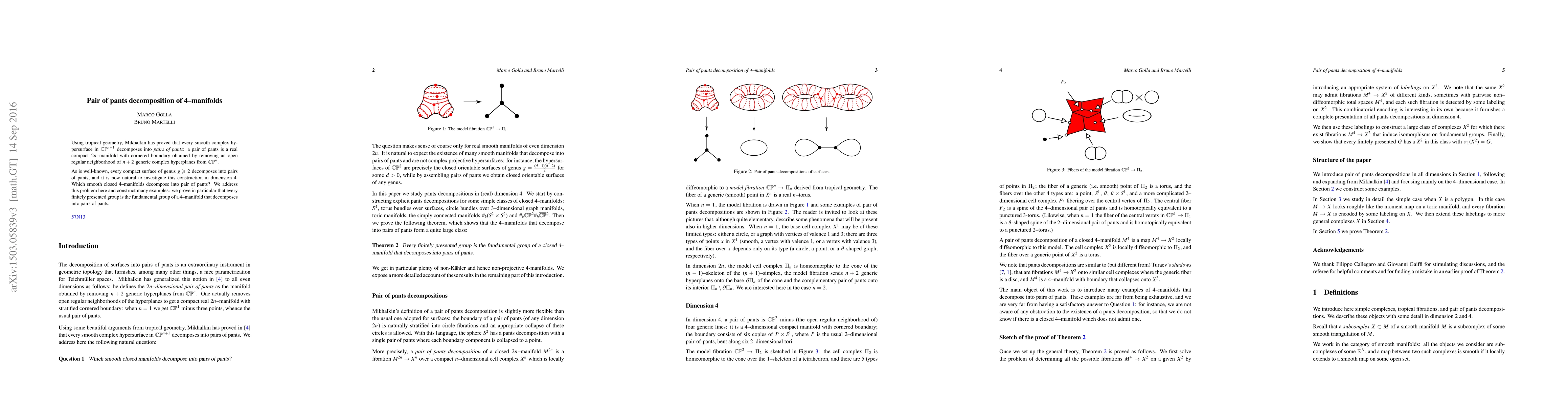 This paper explores the decomposition of smooth closed 4-manifolds into pairs of pants using tropical geometry, extending the concept from surfaces to higher dimensions. It demonstrates that every finitely presented group can be the fundamental group of such a 4-manifold, providing numerous examples of such decompositions.