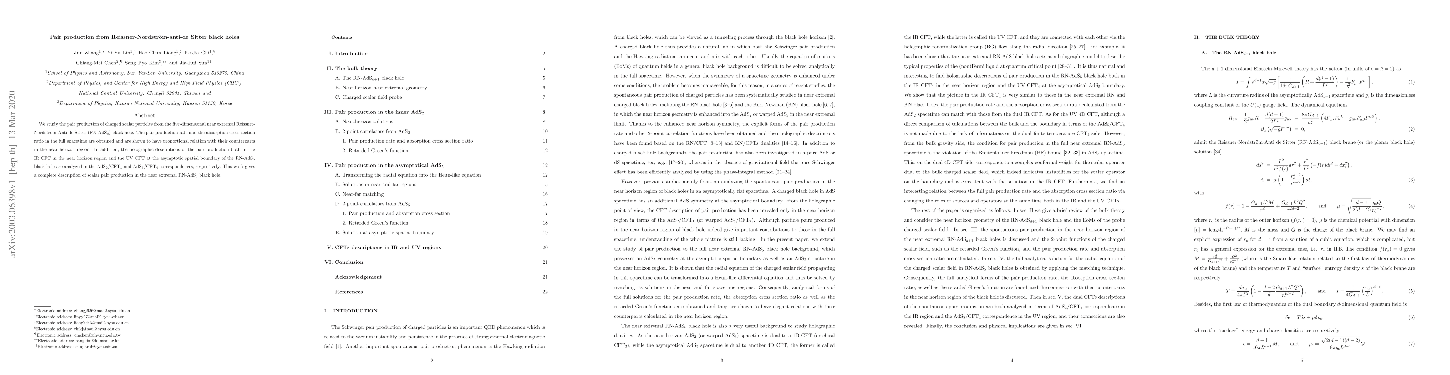 This paper investigates the pair production of charged scalar particles from a five-dimensional near extremal Reissner-Nordström-Anti de Sitter (RN-AdS5) black hole, deriving the production rate and absorption cross section ratio. It also provides a comprehensive holographic description of the process in both the near horizon IR CFT and the asymptotic UV CFT.
