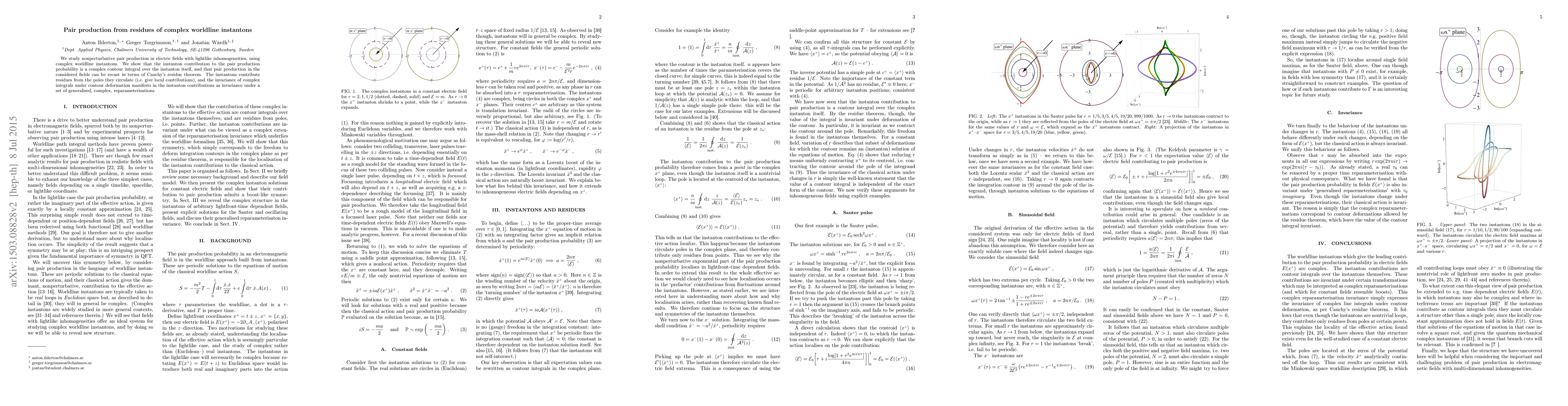 We study nonperturbative pair production in electric fields with lightlike inhomogeneities, using complex worldline instantons. We show that the instanton contribution to the pair production probability is a complex contour integral over the instanton itself, and that pair production in the considered fields can be recast in terms of Cauchy's residue theorem. The instantons contribute residues from the poles they circulate (i.e. give local contributions), and the invariance of complex integrals under contour deformation manifests in the instanton contributions as invariance under a set of generalised, complex, reparameterisations.