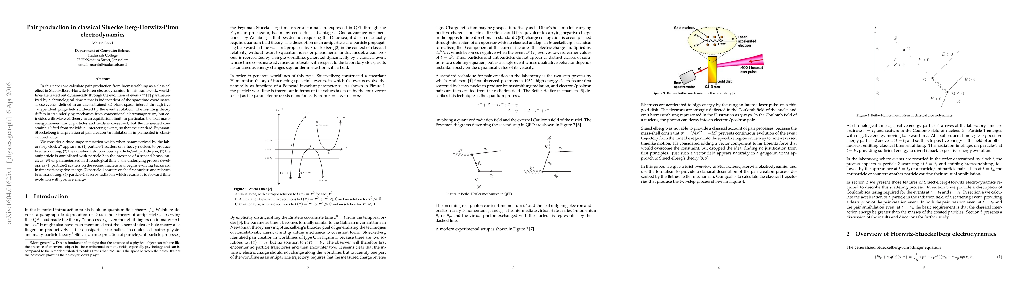 In this paper we calculate pair production from bremsstrahlung as a classical effect in Stueckelberg-Horwitz-Piron electrodynamics. In this framework, worldlines are traced out dynamically through the evolution of events $x^\mu(\tau)$ parameterized by a chronological time $\tau$ that is independent of the spacetime coordinates. These events, defined in an unconstrained 8D phase space, interact through five $\tau$-dependent gauge fields induced by the event evolution. The resulting theory differs in its underlying mechanics from conventional electromagnetism, but coincides with Maxwell theory in an equilibrium limit. In particular, the total mass-energy-momentum of particles and fields is conserved, but the mass-shell constraint is lifted from individual interacting events, so that the standard Feynman-Stueckelberg interpretation of pair creation/annihilation is implemented in classical mechanics.