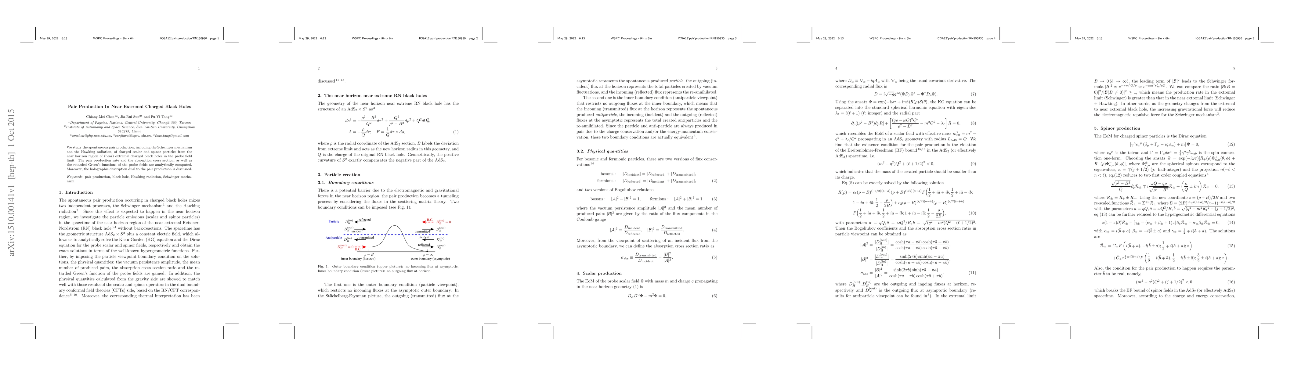 This paper investigates spontaneous pair production, including the Schwinger mechanism and Hawking radiation, of charged particles near extremal black holes, computing the production rate and absorption cross sections analytically. It also explores the holographic dual description of this process.
