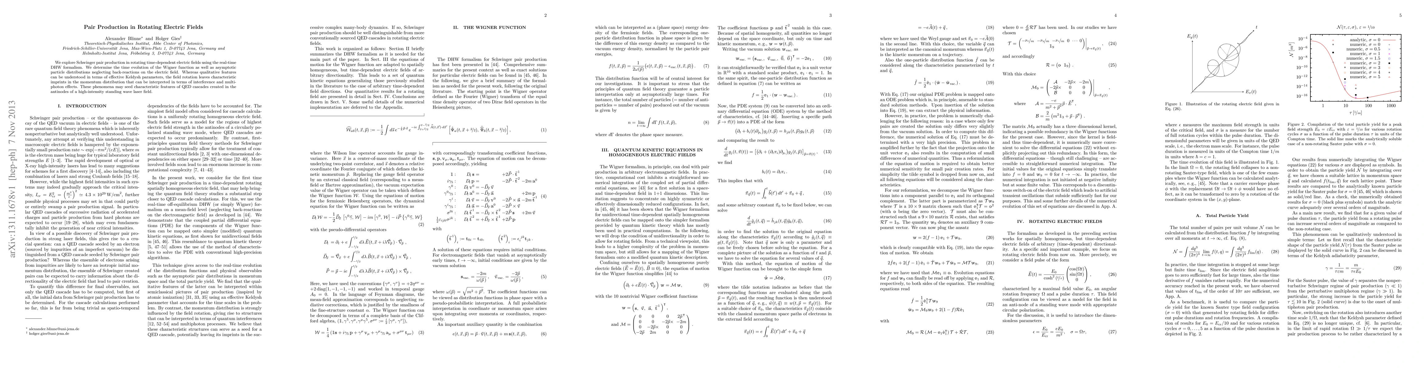 We explore Schwinger pair production in rotating time-dependent electric fields using the real-time DHW formalism. We determine the time evolution of the Wigner function as well as asymptotic particle distributions neglecting back-reactions on the electric field. Whereas qualitative features can be understood in terms of effective Keldysh parameters, the field rotation leaves characteristic imprints in the momentum distribution that can be interpreted in terms of interference and multiphoton effects. These phenomena may seed characteristic features of QED cascades created in the antinodes of a high-intensity standing wave laser field.