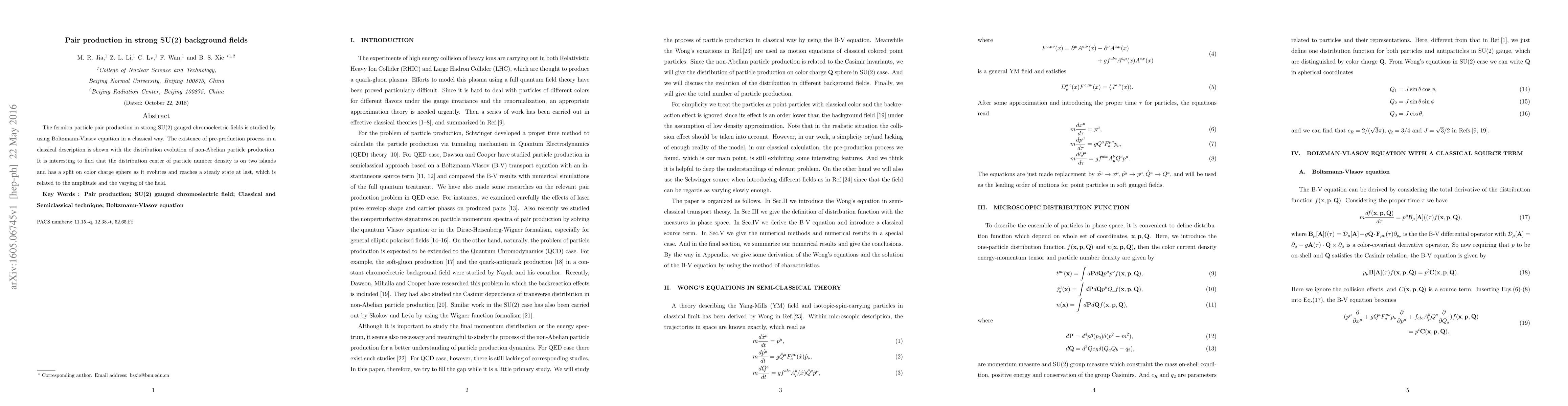 This paper investigates fermion pair production in strong SU(2) gauge fields using the Boltzmann-Vlasov equation, revealing a pre-production process and a unique split distribution of particle number density on a color charge sphere, influenced by field amplitude and variation.