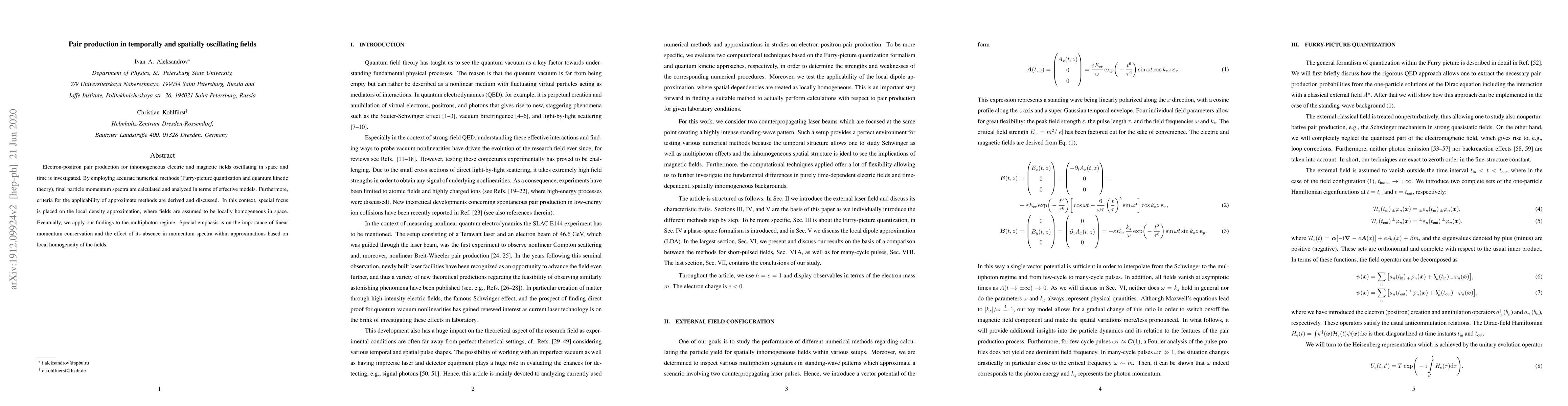 This paper investigates electron-positron pair production in oscillating electric and magnetic fields using numerical methods, deriving criteria for approximate models' applicability, and highlighting the importance of linear momentum conservation in the context of local density approximation. The study also extends findings to the multiphoton regime.
