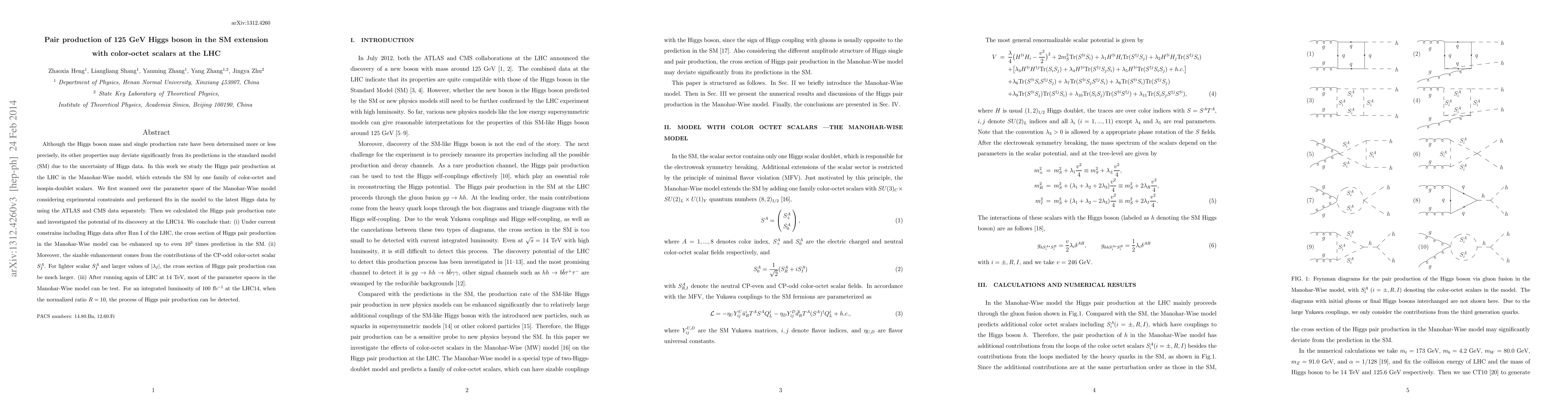 Although the Higgs boson mass and single production rate have been determined more or less precisely, its other properties may deviate significantly from its predictions in the standard model (SM) due to the uncertainty of Higgs data. In this work we study the Higgs pair production at the LHC in the Manohar-Wise model, which extends the SM by one family of color-octet and isospin-doublet scalars. We first scanned over the parameter space of the Manohar-Wise model considering exprimental constraints and performed fits in the model to the latest Higgs data by using the ATLAS and CMS data separately. Then we calculated the Higgs pair production rate and investigated the potential of its discovery at the LHC14. We conclude that: (i) Under current constrains including Higgs data after Run I of the LHC, the cross section of Higgs pair production in the Manohar-Wise model can be enhanced up to even $10^3$ times prediction in the SM. (ii) Moreover, the sizable enhancement comes from the contributions of the CP-odd color-octet scalar $S^A_I$. For lighter scalar $S^A_I$ and larger values of $|\lambda_I|$, the cross section of Higgs pair production can be much larger. (iii) After running again of LHC at 14 TeV, most of the parameter spaces in the Manohar-Wise model can be test. For an integrated luminosity of 100 fb$^{-1}$ at the LHC14, when the normalized ratio $R=10$, the process of Higgs pair production can be detected.