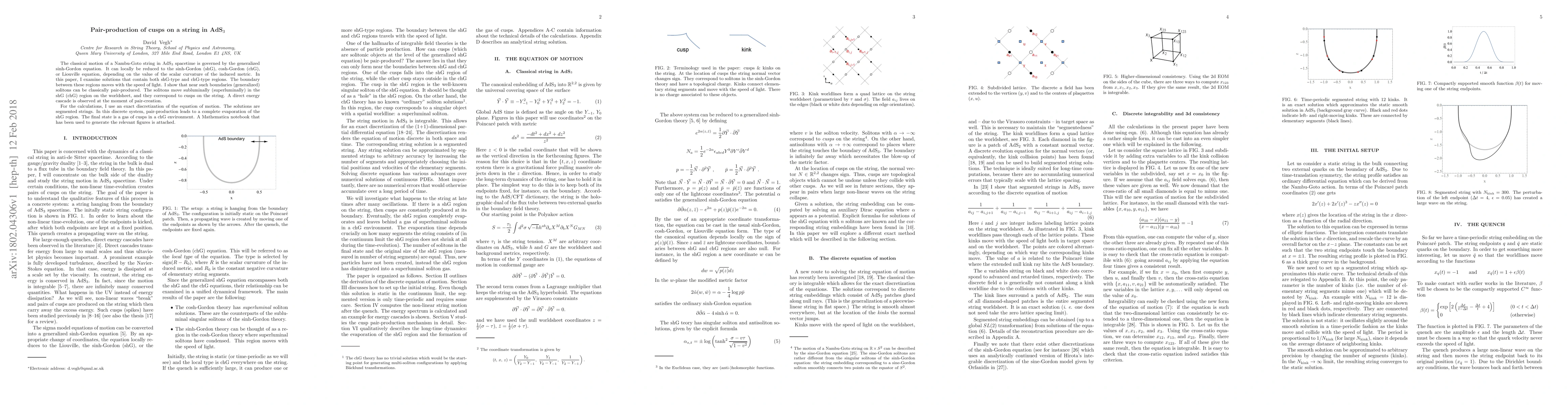 The classical motion of a Nambu-Goto string in AdS$_3$ spacetime is governed by the generalized sinh-Gordon equation. It can locally be reduced to the sinh-Gordon (shG), cosh-Gordon (chG), or Liouville equation, depending on the value of the scalar curvature of the induced metric. In this paper, I examine solutions that contain both shG-type and chG-type regions. The boundary between these regions moves with the speed of light. I show that near such boundaries (generalized) solitons can be classically pair-produced. The solitons move subluminally (superluminally) in the shG (chG) region on the worldsheet, and they correspond to cusps on the string. A direct energy cascade is observed at the moment of pair-creation. For the calculations, I use an exact discretization of the equation of motion. The solutions are segmented strings. In this discrete system, pair-production leads to a complete evaporation of the shG region. The final state is a gas of cusps in a chG environment. A Mathematica notebook that has been used to generate the relevant figures is attached.