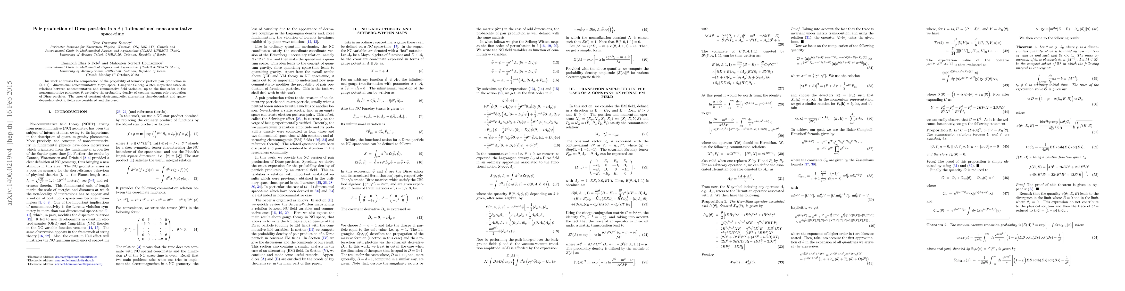 This paper computes the probability density for Dirac particle pair production in $(d+1)$-dimensional noncommutative Moyal space, employing Seiberg-Witten maps to first order in the noncommutative parameter $\theta$. It examines vacuum-vacuum pair production under constant, alternating, and space-dependent electric fields.