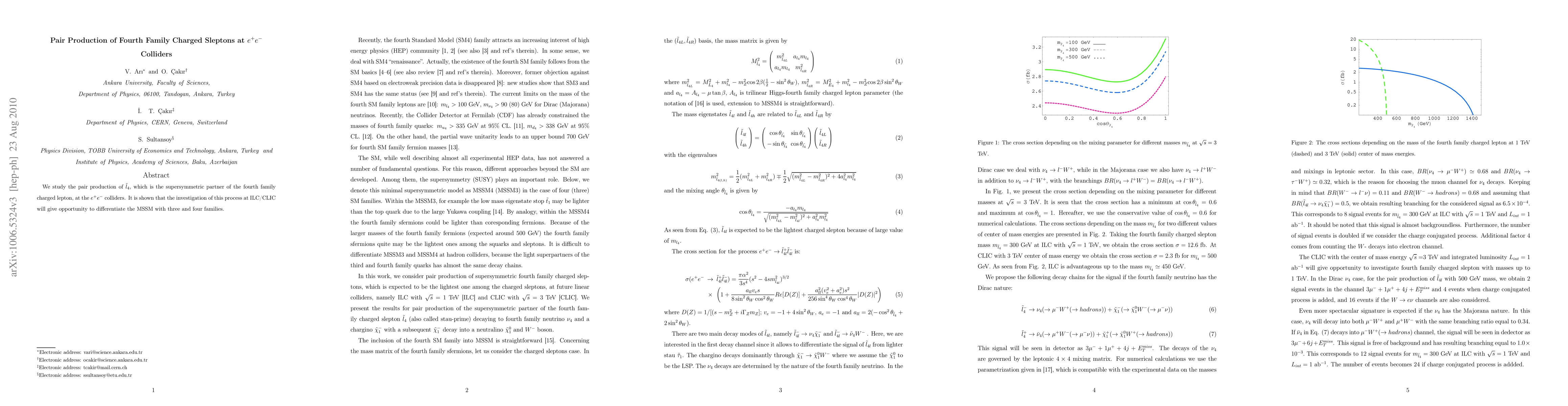 Summary: This paper investigates the pair production of fourth family charged sleptons at $e^{+}e^{-}$ colliders, demonstrating that such studies at ILC/CLIC can distinguish between the MSSM with three versus four families.